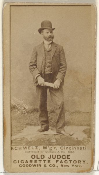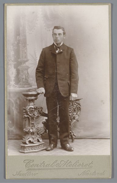 Curator: Here we have "Portret van een jongeman genaamd Diedrich", a gelatin silver print, attributed to Wolffram & Büssenschütt, and likely taken between 1864 and 1866. It presents a formal, full-body portrait. Editor: My initial impression is one of understated elegance mixed with… awkwardness? He seems uncomfortable, doesn't he? Perhaps it's the stance, or the contrast of his checkered pants against the formality of the rest of his attire. Curator: Well, consider the materials involved. A gelatin silver print speaks to a particular moment in photographic technology. It marks a shift in production – more accessible, more replicable images compared to earlier photographic processes. This card format suggests wider distribution, likely intended for personal exchange, similar to calling cards. Editor: That's a great point about the technological shift affecting its circulation. It allows us to examine its role in society at the time. Portraiture, in the mid-19th century, was increasingly accessible to the middle class. It documents the burgeoning visibility and self-fashioning of that social stratum. The photograph itself becomes a form of social currency. Curator: Exactly! And looking closely at his clothes -- that watch chain draped across his vest hints at bourgeois aspiration. It says something about access, not just to photography, but to sartorial markers of status, which photography then helped solidify. Note, too, the prop – that little table – seemingly generic, yet reinforcing the artificiality of the constructed image. The photographer creates an aspirational staging for this sitter. Editor: But the staged setting also plays a role, subtly, in democratizing image-making. Suddenly, owning an image of oneself is less of an aristocratic luxury and more a part of building and participating in civic culture. We also need to examine how this photo functioned institutionally, the photographer's studio as a site for managing image and reputation. The location inscription gives it an extra flavor as a local story of its time. Curator: True, and analyzing the materials and method also invites considering who “Diedrich” was and how this portrait served to mediate and memorialize him within his social network. The photographic practice becomes enmeshed within a network of labour and desire. Editor: It shows that portraiture captures more than likeness. In it you capture shifts in social mores and emerging material cultures of the everyday. Thanks for a wonderful perspective! Curator: A worthwhile pursuit indeed! Thank you.