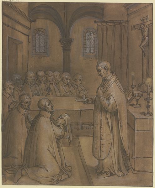 Editor: We're looking at a drawing by Jean-Baptiste Madou, entitled "Hans Memling Presents His Ursula Shrine to the Supervisors and Sisters of the Sint-Jans Hospital in Bruges." It looks like it's rendered in pencil, ink, and other media on paper. There's a muted, somber tone to this interior scene. What do you make of it, from a formal perspective? Curator: Observe the artist’s masterful handling of light and shadow to create depth within the architectural space. Notice how the composition, built around the presentation of the Ursula Shrine, employs a balanced asymmetry. What is the effect of having the figures clustered on either side, rather than a symmetrical arrangement? Editor: It feels like there's more emphasis on the viewers than the object itself. Are the lines more significant than other formal aspects? Curator: Indeed. Consider how the linework varies—bold outlines defining the figures versus the more delicate, atmospheric strokes suggesting the architecture. The hatching and cross-hatching create a textural richness, implying different materials and surface qualities. The light and dark serve to draw one's eye across and into the plane. What about Madou's strategic use of empty space? Editor: It appears that he has chosen to emphasize select elements, thus making other areas almost fade away from our vision. Curator: Precisely. It emphasizes what is essential to the scene, allowing us to concentrate on the interaction between Memling and the religious order within their setting, framed with great focus. Now what might one say of how the medium supports all of these considerations? Editor: I hadn't noticed that. Using the texture of the materials enhances both the interior space and the object that dominates its plane. Curator: The choice of these media emphasizes the quiet gravity of the presentation. Through form, line, texture and the handling of space, Madou directs our attention to what he wishes to highlight. Editor: Thanks! Now I realize the technical artistry brings a greater degree of purpose to the image than I thought possible.