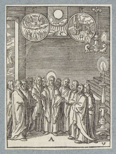 This small print, “Uitstorting van de Heilige Geest,” was made by Antoni van Leest, in the late 16th century, using the technique of woodcutting. It shows a pivotal moment in Christian belief. What's fascinating here is how this spiritual event is mediated through a very physical process. Woodcutting is an old printing technique, where the artist carves an image into the surface of a block of wood, leaving the design raised. This relief is then inked and pressed onto paper. Look closely, and you can see the marks made by the cutting tools, the straight lines and hatched areas, a direct result of the artist's hand working the material. This print would have been relatively quick and cheap to produce, making it accessible to a wide audience. Its small size also allowed for easy distribution. It is an easily reproducible medium, which democratized image-making at the time. So, while the image represents a divine moment, its creation is firmly rooted in earthly materials and processes. In the end, that link reminds us that all art, no matter how elevated its subject, is grounded in the world of making.