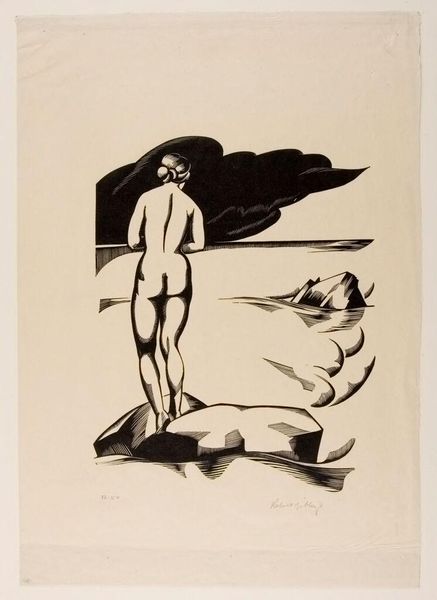 Curator: Here we have Childe Hassam's "In the Surf in a Storm, Easthampton," currently housed at the Harvard Art Museums. Editor: The sheer vulnerability of the figure against such a tempestuous backdrop—it’s quite striking. Curator: Observe how Hassam’s etching technique creates a palpable tension between the figure's smooth skin and the agitated lines representing the sea. The composition, nearly symmetrical, reinforces this contrast. Editor: It speaks to the historical representation of women in art, their bodies often framed against the sublime, uncontrolled forces of nature, reflecting societal power dynamics. Curator: Precisely. The storm, rendered through these furious, short strokes, isn't merely a backdrop; it's an active element shaping our perception of the figure. Editor: I’m left considering the implications of this woman's openness to the storm and what it symbolizes about the relationship between the individual and their environment. Curator: Hassam invites us to consider the formal elements, line and composition, as conduits for understanding the human condition. Editor: A powerful, if disquieting, meditation on vulnerability and resilience.