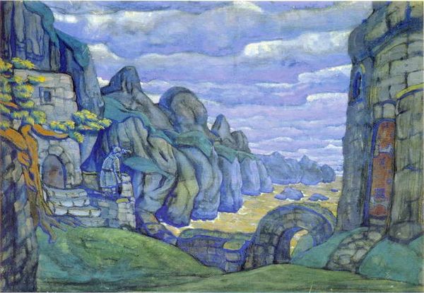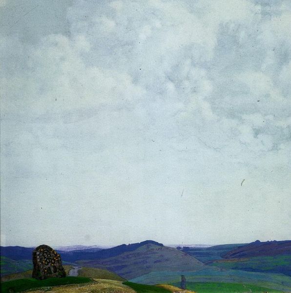 Nicholas Roerich’s "Saint Pantaleon the Healer" is dominated by cool blues, greens and browns, realized with a deliberate, textural application of paint. It's a landscape where the figure of the saint is almost absorbed by the natural surroundings, conveying a sense of serenity and introspection. Roerich uses the structure of the landscape to express deeper philosophical ideas. The layering of the hills, leading up to the expansive sky, suggests a hierarchy of existence. The saint, hunched over and gathering herbs, is formally linked to the earth, suggesting a connection to the healing properties of nature. The formal composition invites a semiotic reading. The saint's bowed posture and the muted palette evoke humility and contemplation, a contrast to traditional representations of saints in more elevated, divine settings. The textural brushstrokes reflect a broader artistic concern with the materiality of paint, moving beyond mere representation to engage with the physical and spiritual essence of the scene. The interplay of color, texture, and composition in "Saint Pantaleon the Healer" invites us to consider the painting not just as a depiction of a saint, but as an exploration of the human relationship with nature.