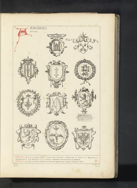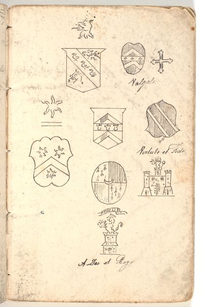 Editor: This is "Negen wapens van raden in de vroedschap van Rotterdam, rechtsboven het wapen van Willem Hogendorp," a pen, ink and watercolor drawing from sometime between 1694 and 1783, currently residing in the Rijksmuseum. Looking at these heraldic crests, I am immediately drawn to the variation in design. They are both aesthetically pleasing and structurally quite diverse. What strikes you first about this work? Curator: The chromatic relationships across the collection of shields is immediately apparent. Observe how each coat of arms employs a distinct palette. Yet, they cohere tonally through the paper’s subtle patina. How does this variance, constrained by the page, speak to you? Editor: I hadn't considered how the constraint of the page ties everything together. Now I am seeing how, even with varying symbols and colors, there is a deliberate symmetry created by their placement, almost a grid of colors and shapes that makes it visually balanced. Curator: Indeed. Consider, further, the implications of the varying degrees of detail in the renderings. Note the contrast between the linear precision in some shields and the painterly looseness in others. Does this variation impact your appreciation? Editor: Absolutely. The varied use of pen and watercolor makes each crest pop uniquely. Like tiny portraits almost! Thanks, I now appreciate the artist's craftsmanship. Curator: The artist has successfully maintained the individuality of the arms while maintaining the work as a unified composition.