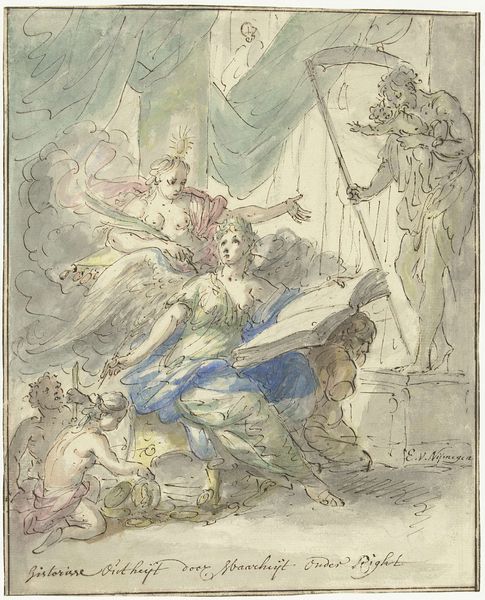 Jacob de Wit rendered this watercolor artwork, Dageraad, sometime between his birth in 1695 and his death in 1754. Here, the winged goddess of dawn, holding high a burning torch, ascends into the heavens accompanied by cherubic figures. The torch, a potent symbol, harkens back to antiquity. It's a beacon of enlightenment and knowledge carried across time. We see echoes of this motif, for example, in ancient Roman depictions of Aurora. The winged figure herself reminds us of Nike, the Greek goddess of victory, or even a Christian angel. These figures convey a sense of triumph and divine presence that resonates on a deeply psychological level. The image evokes a sense of hope. Just as the dawn follows the darkest night, these symbols remind us of the cyclical nature of life and the enduring power of cultural memory. The image resurfaces, evolving, and taking on new meanings in different historical contexts.