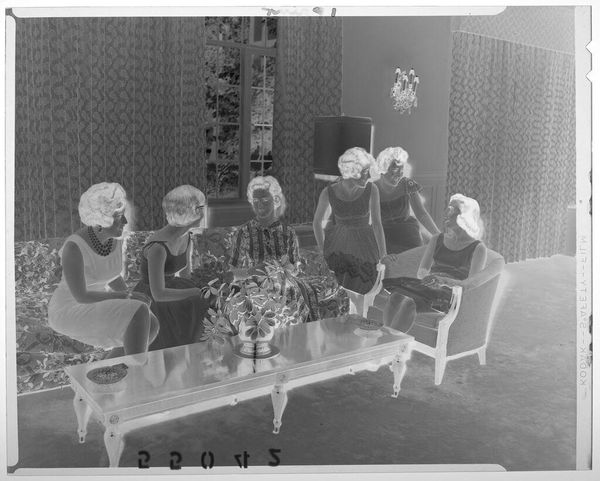 Curator: This photograph, "Untitled (family opening Christmas gifts in living room)" by Martin Schweig captures a moment of domesticity. It's a small, intimate scene, just 10 by 12 centimeters. Editor: It looks like a swarm of dark forms, almost insect-like, gathered around these rectangular shapes. What's happening? Curator: It depicts a family surrounded by Christmas presents, caught in the act of unwrapping. The gifts become almost totemic. Editor: The visual weight of all those packages...it speaks to the sheer volume of material goods associated with Christmas. The labor involved in their creation and distribution must have been considerable. Curator: The act of giving and receiving gifts is deeply symbolic, representing love, connection, and even the continuity of family traditions across generations. It’s a ritual of renewal. Editor: I'm struck by the tension between the abundance of wrapped objects and the ephemeral nature of the moment captured. The photo makes one consider the environmental cost of such rituals. Curator: The photograph transforms a fleeting moment into a lasting symbol, capturing the complex emotions tied to family, tradition, and material culture. Editor: It also provokes reflection on our roles as consumers and participants in a cycle of production and consumption that extends beyond the immediate joy of the holiday season.