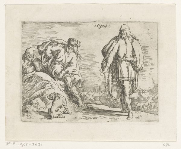 Editor: This ink drawing from the early 18th century, "Standing Old Man with Kneeling Woman and Child Carrying Sticks," by Honoré Coussin, strikes me as quite dramatic. There's a clear sense of narrative, perhaps even hardship. How do you interpret this work, particularly regarding its historical and social context? Curator: That's an excellent starting point. Visually, the contrast between the standing, gesturing man and the kneeling woman immediately creates a power dynamic. But beyond the immediate drama, consider the era. This was a time of immense social stratification, with patriarchal structures deeply embedded in European society. Who is this man and his relationship to the woman? What are they doing? Coussin lived during the tail end of witch trials and other injustices in the Baroque era, and there’s something evocative about a kneeling women near the base of the picture. Do you think the body language and presentation are accidental, or intentional? Editor: I see what you mean about the power dynamic. And knowing more about the artist and his background during that time gives me pause when viewing it now. It might be intentional and the presentation is symbolic of society's ills. Curator: Precisely. Consider also the lack of clear definition of place. Is this about a very specific episode in time or is it intended to evoke every-day subjugation. How does that reading influence your understanding of gender, class and even familial structures? What does this grouping of figures tells us about inter-generational ideas on submission and hierarchy? Does it evoke emotion in you? Editor: Yes it does! Considering your questions about history, Coussin's experience in history and identity makes this piece more layered than I initially thought. Curator: And that's precisely the point. Art, even from centuries ago, speaks to contemporary issues if we engage critically with its historical and social framework. By understanding the power structures implicit in the scene, we can appreciate the drawing as a potential critique of societal norms. Editor: Thank you so much. I'm taking away so much. I will surely never see work this way again!