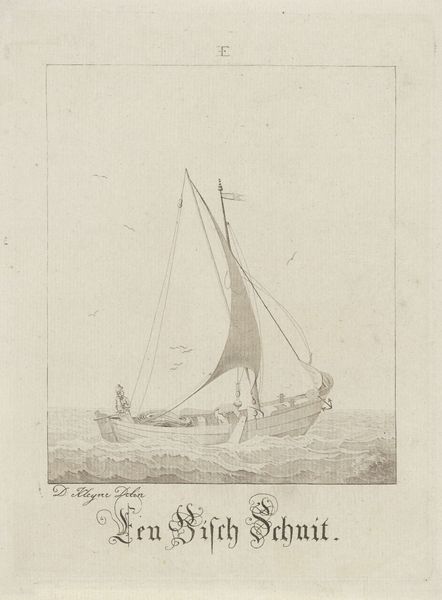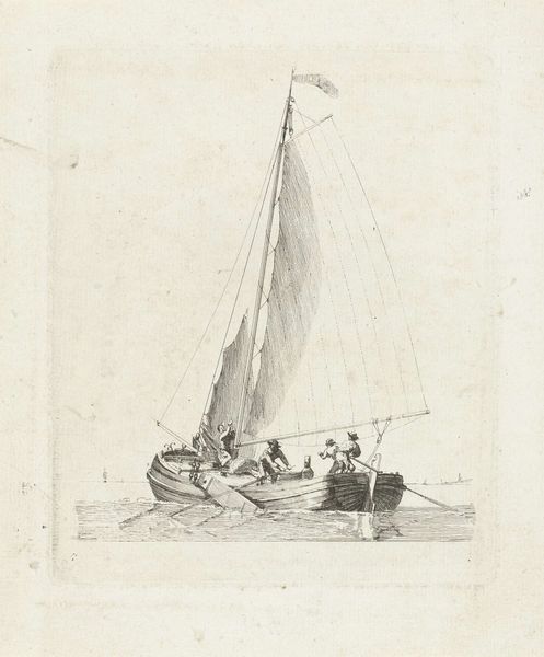 Curator: The first impression I get is that this sketch is quite dynamic despite its rather small scale. Editor: Indeed! The work before us is Gerrit Groenewegen’s "Scholschuit", created around 1787. It resides here at the Rijksmuseum, and the method is etching, or possibly engraving on paper. Notice the diagonal emphasis of the mast, counterbalancing the horizontal insistence of the hull. Curator: It’s a confident line that suggests movement. One thinks of other boats sketched in history - are there types or purposes suggested in this “school” ship you mentioned? I wonder what a scholschuit symbolizes for the artist. Editor: In the symbolic order of maritime art, these boats frequently represented national pride and economic prosperity, the Dutch Republic in command of waterways and sea lanes, even a hint of education and discipline within trade. The billowing sail becomes a potent image of ambition. Curator: A powerful representation, created simply with ink. Look closely at how the etched lines, and see how economical Groenewegen is! Such purposeful brevity generates a tangible depth and texture, with simple visual cues. Editor: And such subtle lines give shape to deep seated cultural memories. The etching evokes an era of exploration, an openness and even audacity. One might find it suggestive of leaving home, as we’d find in folklore. Curator: Agreed, and returning to form: that minimal waterline speaks volumes through sheer economy of mark-making, contrasting the churning sea to a still surface of the page. What's your overall impression, after this scrutiny? Editor: It solidifies the idea that such "quick" sketch actually holds rich depths when considering the artist's own relation to maritime enterprise at the time; it is also of cultural knowledge around journeys of old. Curator: And I see how its deceptive simplicity masks a sophisticated understanding of visual structure. Thank you, this gives an insight to explore in maritime museums everywhere!