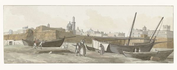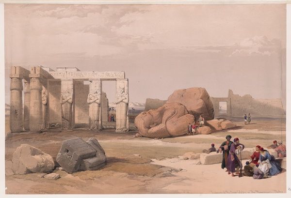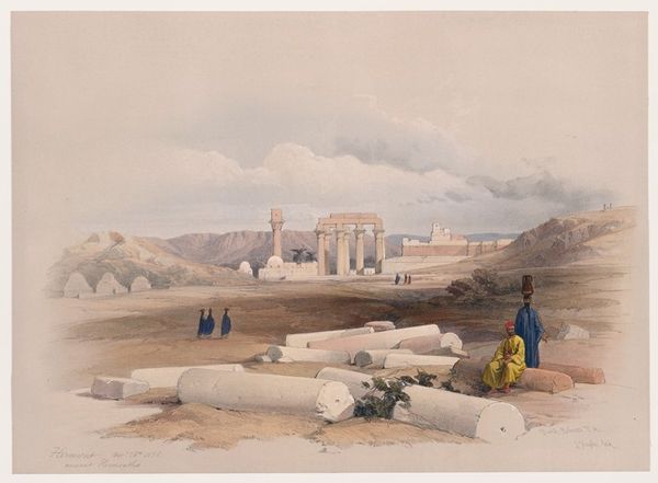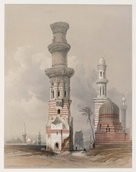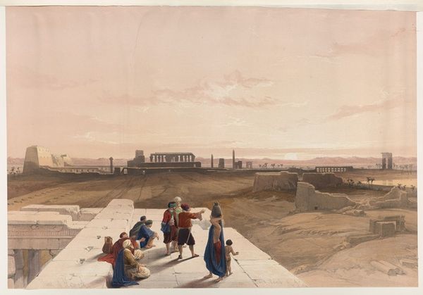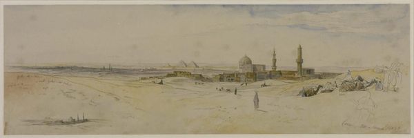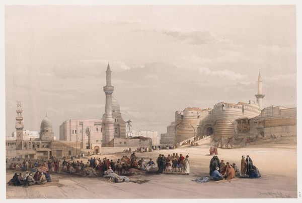 David Roberts created this cityscape of Cairo from the gate of Citzenib, looking towards the desert of Suez. We see an intricate tapestry of architectural forms rendered in meticulous detail. The city unfolds as a series of geometric shapes, dominated by domes, minarets, and cubic buildings, painted in earthy tones. These elements are structured to convey a sense of depth and scale, drawing the eye across the urban landscape to the distant desert horizon. Roberts masterfully uses line and perspective to organize the composition, creating a structured yet expansive field of vision. The formal clarity of the artwork emphasizes the architectural elements as cultural signifiers, reflecting the artist's careful observation and the symbolic weight of the city itself. Note the attention to detail in the rendering of the buildings, contrasted against the fluid brushwork used to depict the sky. This tension between precision and ethereality adds to the artwork's visual interest and invites ongoing interpretation.