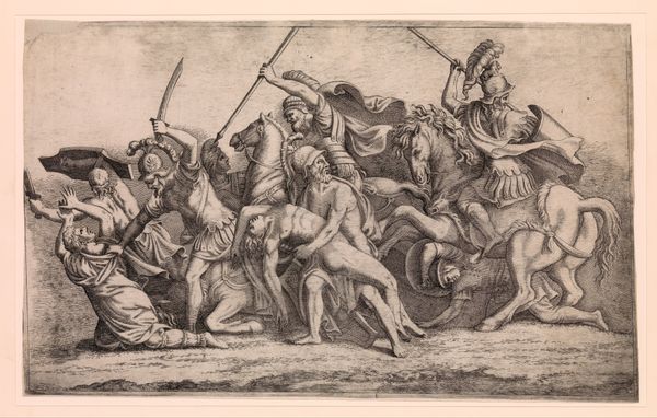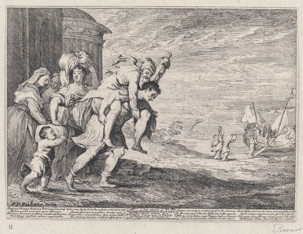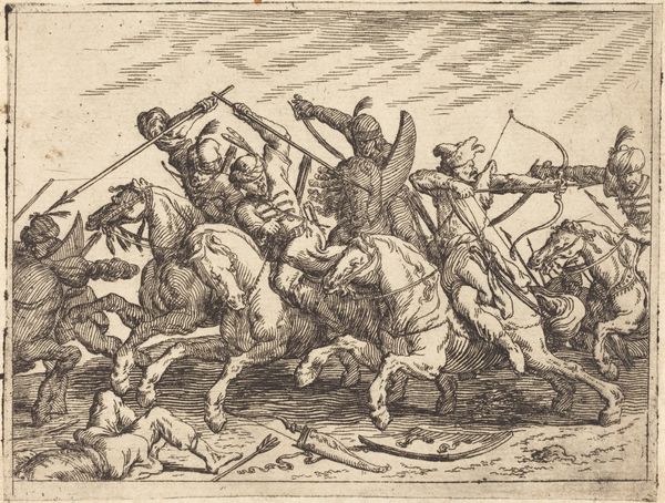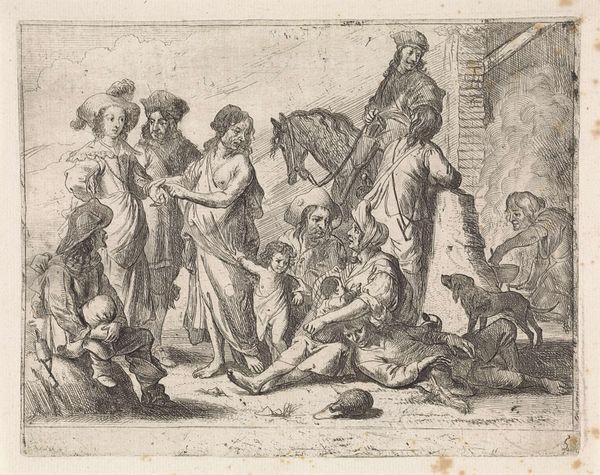 Editor: Here we have Cornelis de Wael's etching, "De Maskerade," created sometime between 1630 and 1648. The energy of the figures really strikes me; it’s chaotic and a bit unsettling. How do you interpret this work? Curator: That energy you sense is key. Beyond just portraying a "maskerade," de Wael, through the lens of Baroque aesthetics, seems to engage with the social dynamics of performance. Notice the figure in blackface—how does that imagery resonate, considering the history of minstrelsy and racial caricatures in Europe and beyond? Editor: That's... troubling. I hadn't considered the implications of the blackface figure within that broader historical context. It feels very uncomfortable now. Curator: Exactly. This etching becomes more than just a festive scene. What power dynamics are at play here? Who is being mocked, and who is doing the mocking? Think about the elites, the wealthy families who are having fun at the expense of others. What does the mask itself hide, and what does it reveal about societal power? Editor: So it's less about a lighthearted celebration, and more about questioning the ways social hierarchies were reinforced through these events? The roles of race, identity, gender, and social standing seem so intertwined here. Curator: Precisely. It invites us to question the norms of that time, and reflect on the continuation of such norms in present day society. De Wael has given us a great reflection piece to view Baroque carnival tradition through a decidedly critical lens. Editor: This piece definitely carries much more weight and complexity than I initially perceived. I am going to continue looking at art through this lens moving forward. Curator: Good; art is powerful, even the art of the past.