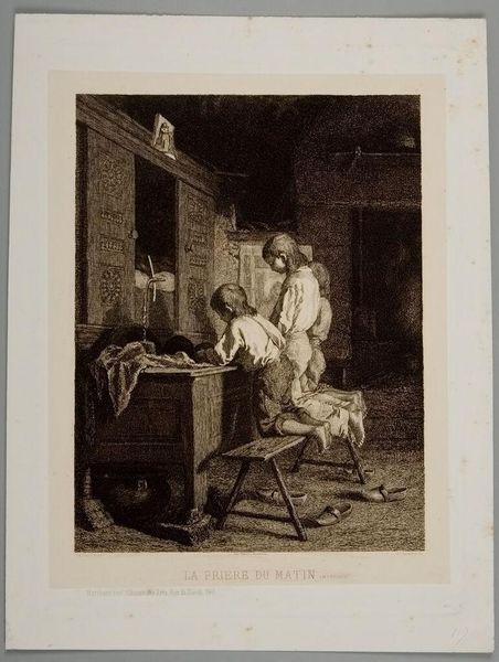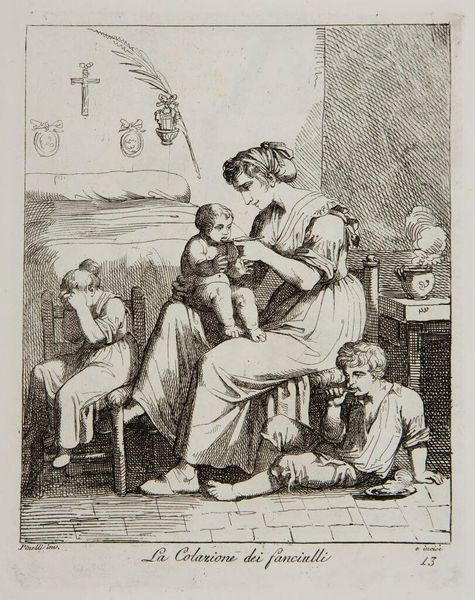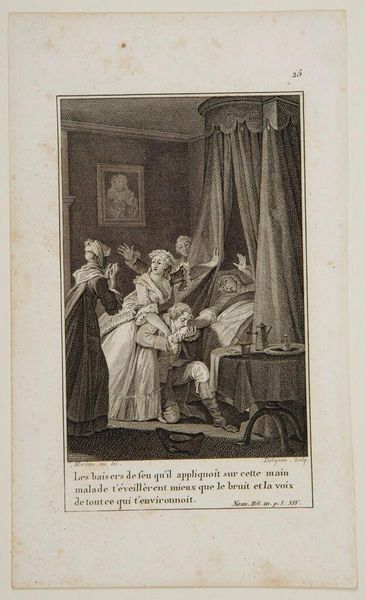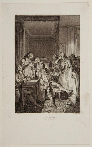 Curator: This is "Letter," an engraving by Johann Georg Wille. It depicts a domestic interior filled with figures. The technique, *à la pointe sèche*, allows for extremely fine, delicate lines. Editor: The composition strikes me as quite charming, almost sentimental. The light seems to focus on the figures, creating a sense of warmth. Curator: Indeed. Wille was renowned for capturing everyday life, and this piece is no exception. Consider the labour involved in printmaking at the time, and its accessibility to a broader audience. Editor: The textures are incredible, though. Notice the contrast between the rough wood and the smooth skin. Semiotically, we can read this contrast as a symbolic representation of social class. Curator: Precisely. And perhaps also the roles within this home. The labour of its members. How their status impacts their lives. Editor: I see how the textures and lines contribute to its deeper meaning. Curator: I appreciate how looking at the materiality draws us into the work’s social landscape.