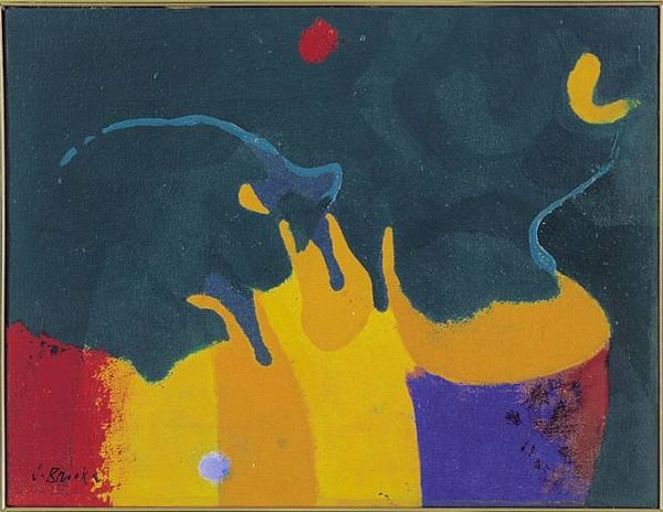 Curator: Helen Frankenthaler's "Plaza Real" from 1988 employs acrylic paint in a manner that defines modern colour-field painting. What's your initial reading of its visual qualities? Editor: Immediately, the high-keyed, warm palette strikes me—the bright cadmium yellow screams 1980s. And that intense ultramarine band anchoring the composition at the bottom—it’s strangely calming against all that solar energy. Curator: The formal tension between that ground, you correctly observe its stabilising nature, and those ethereal, floating forms in the picture plane activates a spatial dialogue. See how the semi-transparent washes build layers, creating depth despite its commitment to flatness. Editor: Right, because the Colour Field painters wanted to dissolve the figure-ground relationship. Yet this almost totemic configuration imposes an interesting, unintended symbolism. In what ways do these shapes engage with abstraction as it developed within modernism, specifically? Curator: The washes allowed Frankenthaler to investigate surface and stain as both form and field, expanding the possibilities that Greenberg proposed. One must recognize the formal aspects through an attention to line, color, and planar relations. Editor: But formalism itself, Clement Greenberg included, evolved through, and alongside specific institutions and cultural imperatives, didn't it? Frankenthaler exhibiting at places like the Jewish Museum certainly influenced how this was read at the time. Do we ever extract artistic output fully from such societal contexts? Curator: Undoubtedly, reception shifts with the zeitgeist. But consider how line asserts itself irrespective of a potential social context— that simple, vertical mark in the upper register echoes down to a thin application of crimson: notice how this line generates an axis. Editor: Agreed. That vertical accent does lend the composition an unusual gravitational center. In conclusion, viewing Plaza Real is quite illuminating as a journey through art's forms. Curator: An articulation which provides great access in a broader social setting.