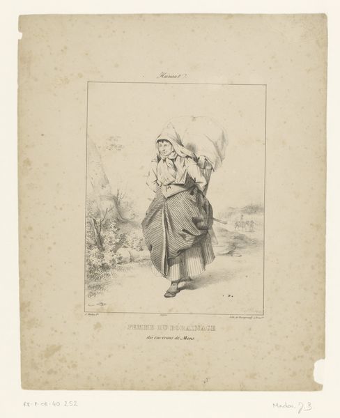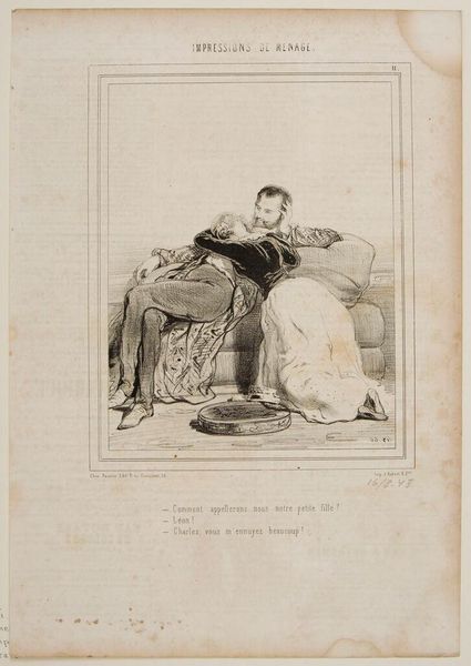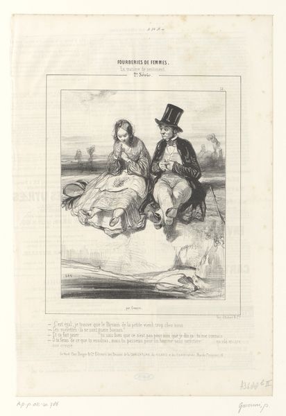 Curator: This print by Paul Gavarni, titled "Man en vrouw bekijken het uitzicht vanaf de heuvel van Montmartre", or "Man and woman looking at the view from the Montmartre hill" in English, made in 1838, gives off a feeling of observation. It is done with a pen and lithograph and is part of the Rijksmuseum collection. Editor: The first thing that strikes me is the almost performative quality. It’s not just a scene, but a commentary, maybe a satire, on how people present themselves within a romantic setting. The way they're positioned—almost staged—makes you question their genuine connection to the view. Curator: Gavarni, working in the tradition of Romanticism and specifically known for caricature, presents a window into Parisian society at the time. The "Patois de Paris" at the top of the page is a social critique. The man’s lounging posture, the woman with her spyglass... These aren't merely figures enjoying a landscape, they are social symbols. The democratization of leisure spaces in places like Montmartre had social implications that were being played out in public. Editor: Yes, there is a definite reading to be found through the implements in the image. Her spyglass certainly catches my attention; beyond simple seeing, she must seek. She wants more. Is this an observation of the growth of technology and society's dependence on new lenses to understand the world? Curator: Undoubtedly. It is this lens metaphor that has such appeal to a society becoming more stratified through technologies, systems of capital and cultural identities. This piece reflects back upon this evolution through dress, technology and attitude. We must ask ourselves: is she really absorbing this moment of Romantic landscape or simply using this public space as a performance? Editor: What fascinates me most is how the landscape itself seems almost secondary. It's a backdrop for this very human, very complex interaction, loaded with visual codes of class and aspiration. It prompts one to look closer at such images for these very historical threads that exist, especially now. Curator: Absolutely. And by viewing through this lens of performativity and satire, we find that such threads in historical material help clarify the evolving dynamics of identity and societal critique across time.