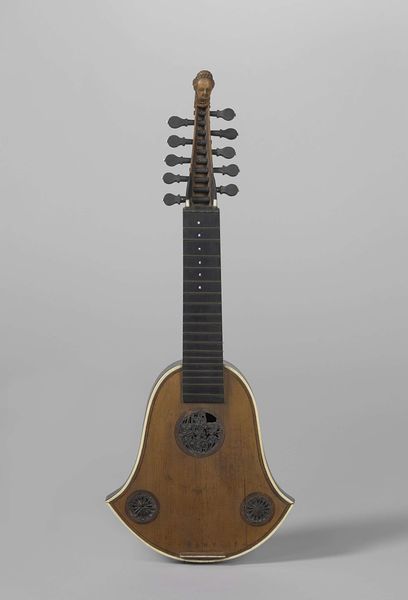 This is a Setar, crafted by Hāj Tāher. The Setar's elegant form consists of an elongated neck and a teardrop-shaped body. The smooth, polished wood is uninterrupted save for the tuning pegs and delicate frets. Its visual simplicity invites a deeper consideration of its cultural role as a carrier of melody and tradition. The instrument’s design embodies a symbolic language of sound. Each curve and line seems deliberately shaped to resonate with both the player and the listener. The linear progression of frets along the neck, and the resonating chamber of the rounded body, invite reflection on how music mediates cultural memory. Its very form encourages a contemplation of music's role in shaping individual and collective identities.
