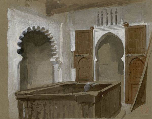 Editor: Here we have John Singer Sargent’s “Pavement,” painted around 1891. It's an oil painting, and I'm struck by the cool tones and the contrast between the bright courtyard and the shadowed doorway. What stands out to you in this piece? Curator: I see a powerful dialogue between light and shadow, yes, but also between cultures and historical memory. The pavement itself, with its mosaic patterns, speaks of ancient civilizations, perhaps Roman or Byzantine, overlaid with the architecture of a more recent, likely Islamic, influence. Do you see how Sargent uses light to almost sanctify the space? Editor: I do. It’s as if the light itself is imbued with historical weight. The cool palette is also a surprise—less ‘sunny’ than I’d expect. Curator: Precisely! That cool light isn’t merely descriptive; it evokes a specific emotional resonance. Sargent seems to be painting a feeling, a sense of place laden with centuries of human experience. The patterns on the ground suggest stories lived, empires risen and fallen, faiths practiced. What stories might these surfaces tell us? Editor: It's fascinating to consider how these visual elements act almost as a cultural palimpsest. I hadn’t considered how the artist intentionally invites you to imagine histories upon histories… Curator: It's this very layering, the superimposition of symbol upon symbol, that gives “Pavement” its enduring power. Sargent doesn't just show us a scene; he offers us a meditation on time, memory, and the silent language of cultural exchange. Editor: I see it now; I had only thought it to be just a study of light and composition! This has truly deepened my appreciation for how visual art encodes meaning.
