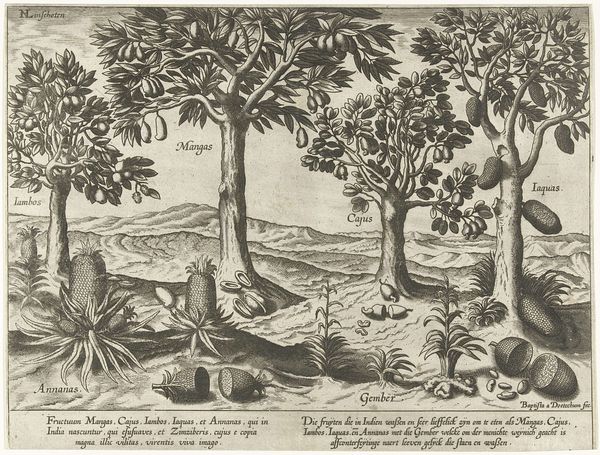 This etching, "Fruitbomen en kruiden op Java," from 1596, showcases the exotic flora of Java through the eyes of an anonymous artist. Dominating the scene are three prominent trees: the 'Palmitas', the 'Iacca', and another laden with round fruits. These botanical symbols offer more than just a glimpse into a faraway landscape; they open a window into cultural exchange and the European fascination with the natural world. Consider the palm tree, or 'Palmitas'. Throughout history, this symbol appears in various contexts, from ancient Egyptian art, where it represented triumph and eternal life, to its later adoption in Christian iconography as a symbol of martyrdom. Its presence here speaks to a broader human impulse to understand and categorize the world, to find familiar meanings in foreign forms. The image resonates with our collective memory, evoking a longing for paradise and a curiosity about the unknown. These depictions are not merely botanical illustrations. They’re vessels carrying cultural and psychological baggage, engaging us on a subconscious level with dreams of distant lands and the allure of the exotic.