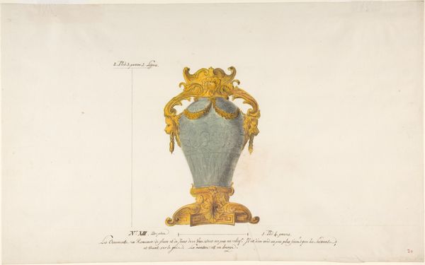 Curator: This drawing, titled "Design for Three Vases," dates to between 1765 and 1790 and is currently held in the collection of the Metropolitan Museum of Art. It's attributed to an anonymous artist. What's your initial reaction? Editor: My first thought is of elaborate staging! The way the gold leaf seems to both restrain and enhance these glazed ceramic forms evokes a conversation around power and prestige, don’t you think? Curator: Absolutely. The Rococo style here speaks to that—a very self-aware performativity in aristocratic culture. Consider the materials. The watercolor and intaglio work highlights how objects, especially in the decorative arts, mirrored societal values regarding beauty and excess during this era. What stories do you think they were designed to tell? Editor: It's interesting you frame them as storytelling objects. Given that ceramic production was hardly a straightforward endeavor in the late 18th century, with its heavy reliance on skilled labor, do you see these objects as bearing the marks of that labor too? Curator: I think so. Though the artist is anonymous and that makes reading into intention hard, these weren't merely functional items. Their intended use, and who had access to them, reflect rigid class divisions and the exploitation inherent in creating luxury goods, particularly impacting women and other marginalized workers, correct? The very making and displaying of such items asserted social dominance. Editor: Exactly. The form follows this, too. It’s that careful choreography between opulence and restraint – all held together by those metallic flourishes. We have to consider labor when understanding the history. Curator: Agreed, focusing too much on surface-level aesthetics obscures that story. Ultimately, the social history, and its connection to objects that both masked and benefited from it, demands a full-fledged analysis, connecting history, class and labor! Editor: I think seeing art through the prism of production helps to keep the bigger story afloat and foreground the lived experiences behind supposedly untouchable, exquisite artifacts like these vases.