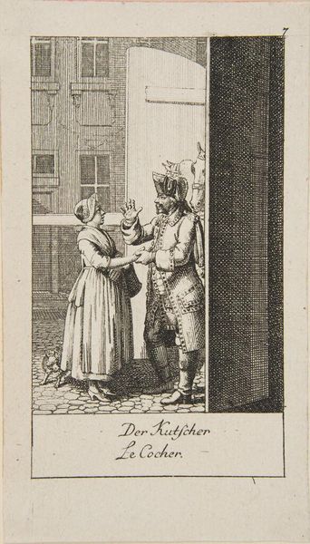 Curator: This is Daniel Chodowiecki's engraving, an illustration titled "The Butcher" for a series called "Wedding Proposals." It’s diminutive, only about 8 by 5 centimeters. Editor: There’s an awkward sort of tenderness to it, isn't there? Like a scene caught off guard. Curator: Absolutely. The dog in the background seems to reflect that sentiment, unsure if it should celebrate or run away. Editor: What I find striking is the butcher's attire—the tools, the meat hanging behind him. It's a very visceral proposal indeed! A promise of provision, perhaps? Curator: It’s a rather blunt proposal, no doubt. The imagery is grounded, connected to the very basis of survival and sustenance. Editor: One wonders what she made of it all. Though really, isn't every proposal a negotiation of power and provisions in some way? Curator: Precisely, and Chodowiecki captures it with a wry, knowing humor. A slice of life served up with a side of social commentary. Editor: A miniature drama with implications that resonate even now, wouldn’t you say?