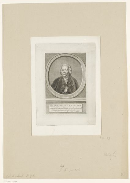 Curator: This is an engraving from 1858, after a portrait of Jean Baptiste Rousseau, the 17th-century French poet. Editor: It strikes me immediately as understated. The monochromatic palette and delicate linework impart a sense of quiet dignity. Is that oval format significant, do you think? Curator: It's interesting you notice that, because it’s part of a long tradition of portraiture to commemorate and sometimes even idealize individuals. Setting the bust within the oval frames the sitter, literally isolating them within the composition while figuratively elevating them for posterity. This portrait as object is a method of cultural canonization through its various printing reproductions. Editor: The textural variation achieved with the engraving is compelling; from the almost cloud-like quality of the wig to the crisper lines defining his jacket, there is great command over light and shadow. Was the original painting in a similar baroque style? Curator: Considering Rousseau was a noted figure during the height of the Baroque, that seems likely. What interests me, however, is how printmaking democratized the Baroque aesthetic and portraiture. Instead of paintings exclusively for the wealthy, engravings circulated images and ideas across a wider population. So you get the essence of the image through dissemination rather than through aura of unique artistic expression. Editor: A fascinating observation regarding democratization, indeed, particularly for our modern appreciation of artworks that transcend social boundaries and provide opportunities for engagement in historical dialogue. Curator: Thank you. Examining the material conditions and distribution networks challenges assumptions around artistic value—a pertinent lesson for today’s image-saturated world. Editor: Indeed, a pertinent lesson echoing from history to inform contemporary engagements with visual media. Thank you.