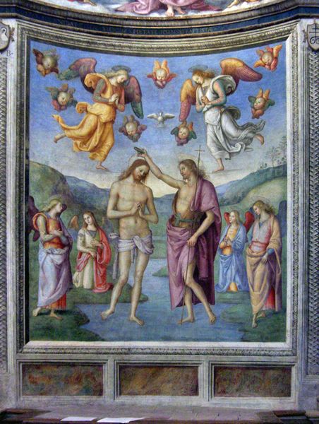 Editor: Here we have Domenico Ghirlandaio's "Baptism of Christ," a fresco from 1473. It has a solemn, almost reserved quality, don't you think? The figures seem very composed, even as the water rushes around them. What’s your perspective on it? Curator: Reserved is a good word, and yet I find a deep undercurrent of expectation. Ghirlandaio positions John the Baptist not so much *performing* a baptism as presenting Christ – imagine the anticipation of the witnesses. This fresco breathes the Early Renaissance: earthly but also touched by something profoundly spiritual. Do you notice the details of the landscape receding behind them? The real world placed just behind the sacred event? Editor: I see the background, it's rendered with detail but is pretty pale. I didn't appreciate its function as staging for the event. Tell me more about Ghirlandaio and this sort of composition? Curator: For Ghirlandaio, perspective wasn’t just a matter of making things look realistic. He's using it to guide your eye, placing figures in a context that feels both familiar and otherworldly. Note the placement of the angels; aren't they like figures caught between reverence and curious observation? And above it all, God watches. Editor: It’s almost like he’s directing a play. The landscape is the backdrop, and the figures are carefully arranged actors, each with their part to play. Curator: Exactly! Each detail feels like a carefully chosen word in a poem, creating a world that's simultaneously believable and divinely inspired. Ghirlandaio is building meaning one deliberate stroke at a time. Editor: This has made me look at this work with new eyes. It is like seeing a frozen moment in a very important scene! Curator: Indeed, isn't it glorious to think that even now, the paint holds secrets, whispers of a world once known? It keeps us curious, which is why we need great editors like you to keep sharing these magnificent moments!