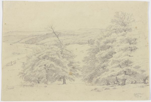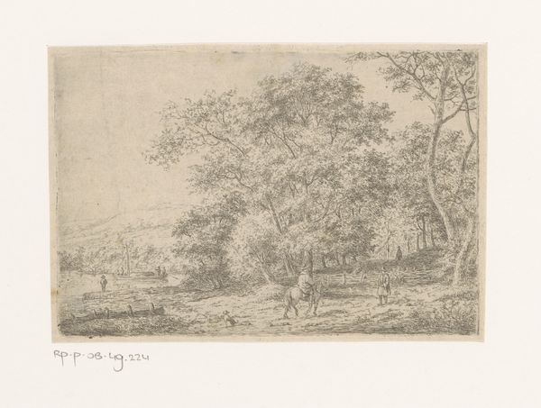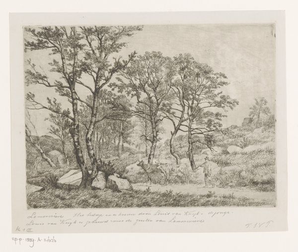 Curator: What a subtly powerful image! This etching by Jean Pierre François Lamorinière, created sometime between 1838 and 1889, offers us a "View in the Forest of Fontainebleau with Two Cows." The original is held right here at the Rijksmuseum. What strikes you about it? Editor: There's a wistful, almost melancholy feel. The monochrome and fine lines make the whole scene look fragile, like a fading memory of a once vibrant landscape. And the scale is so intimate, it feels very personal, almost like a peek into someone's quiet contemplation. Curator: It’s interesting you say “memory,” because the Forest of Fontainebleau held enormous cultural weight for artists of the time. It was not just a landscape, but a symbol of freedom and artistic integrity. It was politically charged because it allowed landscape painters the autonomy to work independently outside the constraints of academic and urban life. Editor: The trees certainly command attention here. Their gnarled forms, almost reaching out, could be interpreted as symbols of endurance and connection to the earth. Trees are ancient symbols with so much embedded cultural memory: growth, family trees, sheltering entities. I am curious why cows? Curator: Yes, those gentle cows. We shouldn't overlook them. Here, they serve, in part, as emblems of rural, simple life but are also representative of private ownership and industry, particularly the developing dairy industry. So the painting delicately balances idyllic naturalism with emerging capital interests. Editor: So those bovine figures suggest a subtle dialogue between humans and nature. What do you think the audience was expected to take away? Curator: Certainly, a longing for the purity of nature, but also perhaps a more nuanced view of the changes taking place in the countryside. Landscapes at this time became more politically charged as a stage for industrial developments and changing forms of social leisure. Editor: The delicate etching certainly makes one think! For me it prompts ideas of human interaction within the larger systems of nature and agriculture; like an awareness that everything is intertwined. Curator: That sense of intertwined lives feels like a great place to conclude our brief journey into this serene yet thought-provoking scene. Editor: Yes, a quiet meditation on nature and its cultural echoes. Thank you.
