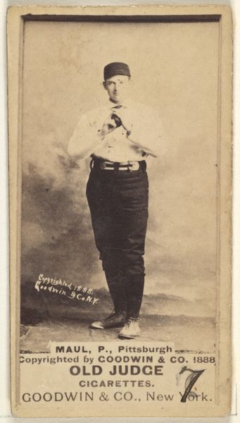 Card Number 106, Lillian Russell, made by W. Duke, Sons & Co., is a small yet captivating piece intended to promote Cross Cut Cigarettes. The sepia tones lend a nostalgic quality, inviting contemplation on the interplay between commerce and celebrity. The composition centers on Lillian Russell, her form structured within the frame with attention to the vertical and horizontal axes. The symmetry of her pose, with hands casually placed in pockets, creates a balanced, almost architectural stability. However, this symmetry is subtly disrupted by the tilted angle of the text promoting the cigarettes, introducing a dynamic tension. This tension reflects a broader semiotic system: Russell’s image, a signifier of beauty and success, is strategically linked to the cigarette brand, aiming to transfer those desirable qualities. Ultimately, the card’s genius lies in its structural simplicity and the sophisticated semiotic game it plays, using Russell's image to elevate a mundane product. It acknowledges the viewer's intelligence, inviting them to decode the message and, perhaps, be subtly swayed.