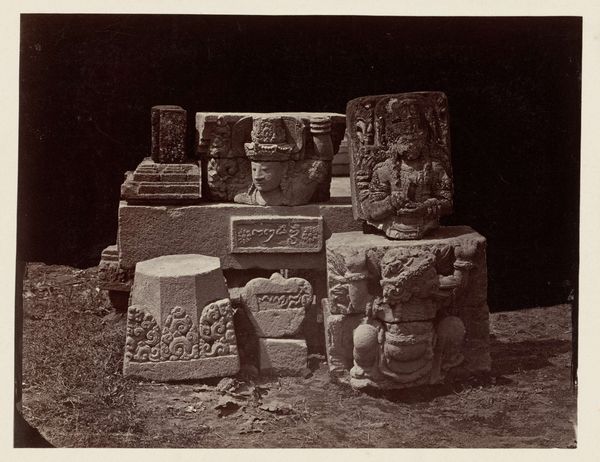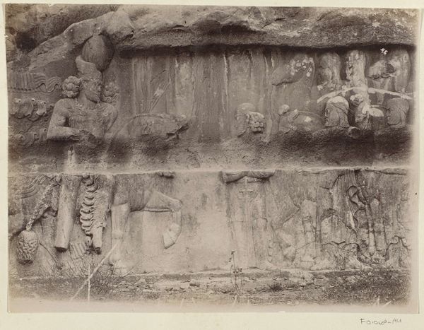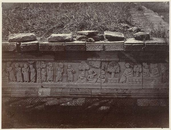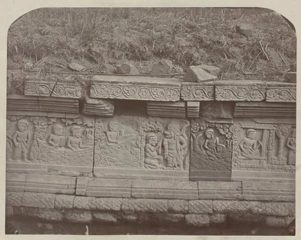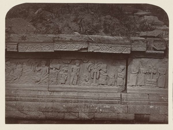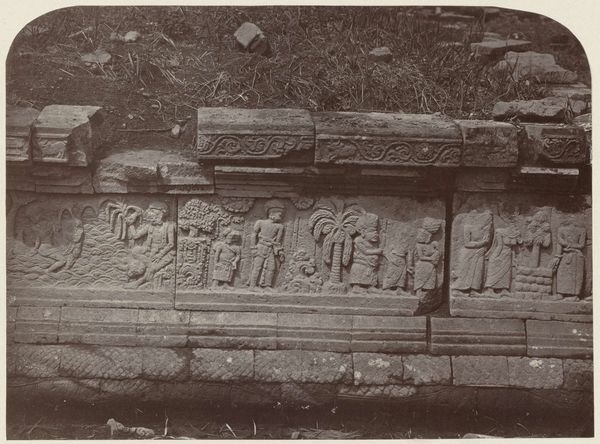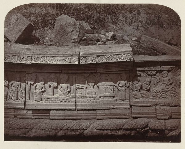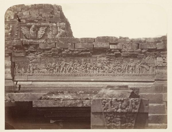 Editor: This photograph, taken possibly around 1867 by Isidore Kinsbergen, documents a bas-relief on the pendopo of Candi Panataran in Indonesia. The stone carving, with its landscape backdrop, gives a strong sense of cultural preservation, though in sepia tones. What catches my eye is how the composition seems to blend storytelling with architectural form. What kind of narrative do you think it conveys? Curator: The integration of narrative reliefs into architecture, particularly sacred structures like Candi Panataran, speaks to the temple's function as a repository of cultural memory. The bas-relief becomes a visual language. Consider how this photographic record transforms the tangible stone into a persistent, reproducible symbol. Editor: That’s interesting. Do you mean the photo itself now becomes part of that visual language? Curator: Precisely! The very act of photographing and re-presenting this image almost participates in an ongoing cycle of cultural transmission. Each carving depicts particular deities, or characters involved in traditional local folktales – which would’ve been immediately readable by the original audience. Do you see anything familiar or strange? Editor: Well, the figures definitely have an otherworldly feel. Some almost look animalistic. Curator: Indeed! The hybridization of human and animal forms in the carvings alludes to spiritual connections beyond the material realm. Each hybrid would represent different values, acting almost like allegories. And notice how nature interweaves—trees, mountains. It suggests an interconnected cosmos where humans, deities, and nature are inseparable. What do you make of that integration? Editor: I see how all the symbolic characters contribute to its overall storytelling effect. Now I realize the relief is not simply decorative but educational, like reading an illustrated ancient poem! Curator: And how that photo can carry those narratives into a different kind of present. We find the photo preserving something more, it makes one wonder about who got to see it, and how their understanding would resonate into the present, perhaps inspiring new artistic approaches. Editor: Exactly! I can appreciate the role of images and photography in cultural heritage now. It is much more complex than I previously understood.