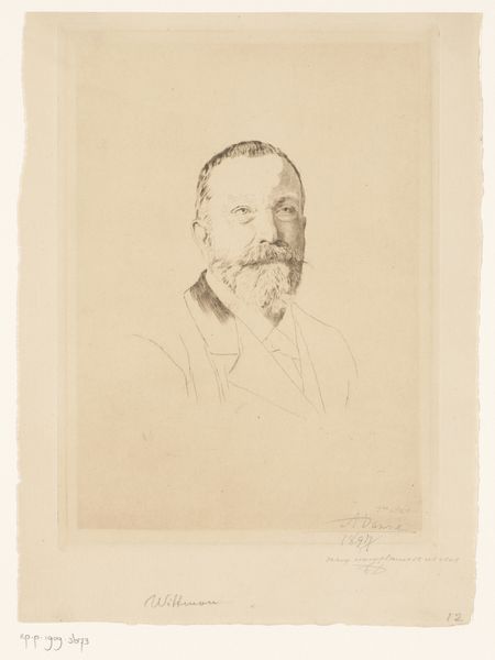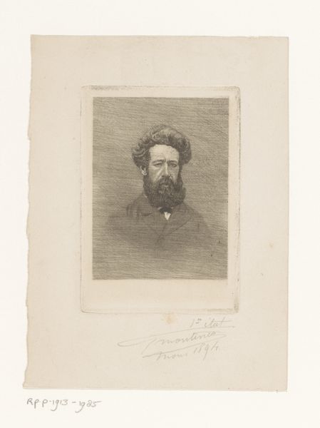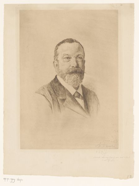 Editor: We're looking at an 1887 portrait, "Portret van Emile de Mot, schepen en later burgemeester van Brussel" by Auguste Danse. It's a pencil drawing, and there's something incredibly dignified, yet also quite immediate about it. What do you see in this work? Curator: Well, my eye is drawn to the sheer confidence Danse demonstrates in his line work. There's a beautiful economy in each stroke. Think about capturing not just a likeness but a presence, a life, with what's essentially just graphite on paper! It feels almost… like peering into a memory, doesn't it? Editor: I agree! The way the lines are so delicate, especially around the eyes, gives him a very thoughtful expression. Did this kind of formal portraiture serve a particular purpose back then? Curator: Absolutely! Consider photography was still finding its feet as a readily accessible medium. Commissioning a portrait like this was a statement—a mark of status and legacy, immortalizing oneself in art. But Danse offers something beyond just documentation. There's a sensitivity that elevates it. Do you notice the soft hatching that defines the light on his face? Editor: Yes, it's subtle, but it really adds depth. It's not just a record; it's an interpretation. Curator: Exactly! And that's the magic, isn't it? It’s that personal touch, the artist's perspective shining through even in something ostensibly created for posterity. Editor: I never thought about how much emotion could be conveyed in such a seemingly simple drawing. Thanks, I really appreciate the insights! Curator: My pleasure! It’s these little whispers from the past that make art history such a rewarding conversation, don't you think?