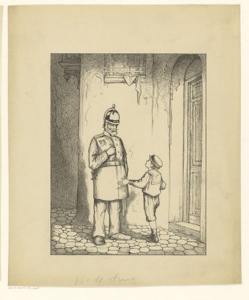 Curator: Here we have "Jongen en politieman op een straat," which translates to "Boy and Policeman on a Street," a pen and ink drawing created sometime between 1887 and 1916 by Willem Pothast. Editor: The mood strikes me as oddly theatrical, almost dreamlike. The strong light source is so dramatic. Is the policeman interrogating this child? Curator: Possibly, or offering assistance. Genre scenes such as these offer small snapshots into urban life at the turn of the century, though that encounter remains ambiguous, and Pothast doesn't leave many clues in his style of realism. The drawing’s setting may point to that moment's culture. Editor: The way the light pools on the boy’s face emphasizes a sort of vulnerable honesty. I'm intrigued by what their relative positions signal about power dynamics at the time – that an ordinary kid could find themselves at the whim of someone tasked to surveil. Curator: Pothast, through his choice of this everyday interaction, invites viewers into that social contract. He depicts these scenes to address cultural norms of his time. We could perhaps interpret the light beam, coming from an officer's lamp, as a metaphorical light to represent authority and surveillance, where the system attempts to reveal and perhaps reform the child. Editor: Yes, this makes me think about systems of control, then and now, and how institutions impact our sense of safety or endangerment. I appreciate that the piece sparks thoughts about how such systems might particularly affect marginalized members of our society. Curator: And it's within such artistic mirrors that societal conversations really find substance. What do we accept and question through observation. Editor: Absolutely. The way it quietly challenges us to reconsider the status quo is a credit to Pothast's subtle art.