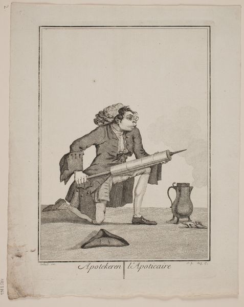 Editor: So, this is "Kiøbenhavns Skilderie," number six, an etching by J.F. Clemens, created sometime between 1785 and 1788. It's got this sort of ghostly scene projected, almost like an early film. What strikes you most about it? Curator: Well, isn't it delightful? It’s a window into a bygone world, presented, quite literally, as a window! It makes me ponder what that banquet table holds... stories, gossip, perhaps political intrigue, all viewed through the curious lens of enlightenment era technology. Do you think Clemens aimed to democratize such exclusive gatherings by "projecting" them? Editor: Democratize... that's an interesting take. I was just thinking about how *exclusive* it seems. Like we're getting a peek into something secret and refined. Curator: Precisely! That tension, that very push-and-pull, that's where art truly sings, wouldn't you agree? It is, after all, a rather cerebral approach for what, in essence, is a caricature. I find it funny he presents this “high society” with what amounts to a glorified peep-show. Do you suppose he did this for the shock value? Editor: Oh, absolutely! A bit of subversive fun, maybe. It gives you a chuckle, imagining the elite of Copenhagen being broadcast in this grainy proto-cinema. It’s witty. Curator: Yes! I find it rather wonderful. And there's that quiet intimacy in the drawing itself. Such stark contrast against that soft vignette. Like a secret whispered in a crowded gallery, wouldn’t you say? Editor: Definitely. It makes me rethink what "history painting" could be. Thanks, this really gives you a different lens on history! Curator: Exactly. In the end, aren’t we all just characters in someone else’s “Kiøbenhavns Skilderie”? Just some blurry vignette being briefly studied by an audience we can't even see?