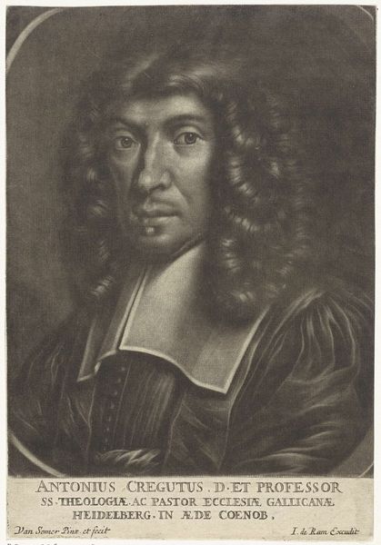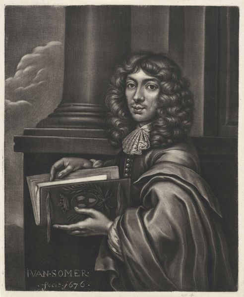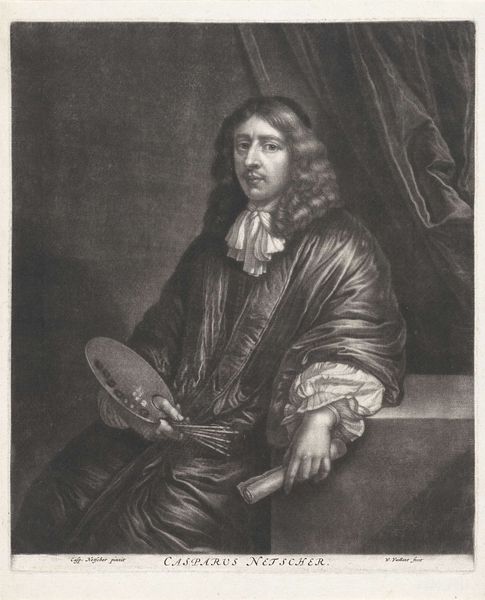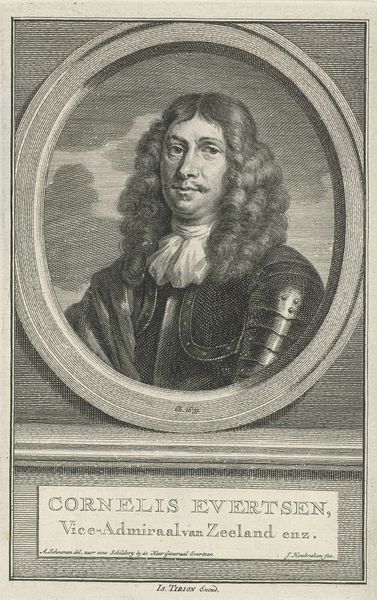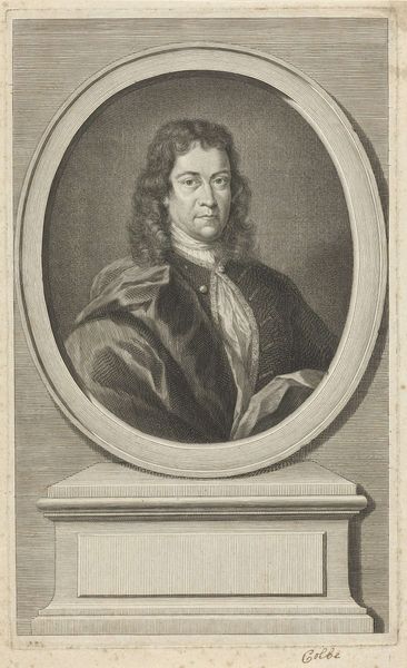This is Arnoud van Halen's self-portrait print, probably made with etching, around the turn of the 18th century. The print is dominated by the figure of the artist, framed within an oval border. The composition is simple, almost symmetrical, emphasizing the artist's face and attire. The contrasting textures draw our attention: the soft, flowing hair, the stiff, pleated collar, and the rich, draped fabric. These are rendered in a monochromatic scale, which invites a semiotic interpretation. The texture of the clothing and hair signifies status, while the formal pose suggests a self-conscious presentation. Consider the structural interplay between the oval frame and the figure within. The frame offers a boundary, yet the artist's gaze extends beyond it, engaging the viewer directly. This break in the pictorial plane destabilizes the traditional portrait's fixed meaning. The print operates within a cultural discourse of representation and identity. Its formal qualities push against conventional portraiture. It is a performance of self, mediated through the technical precision of printmaking. It remains an open field for ongoing dialogue.