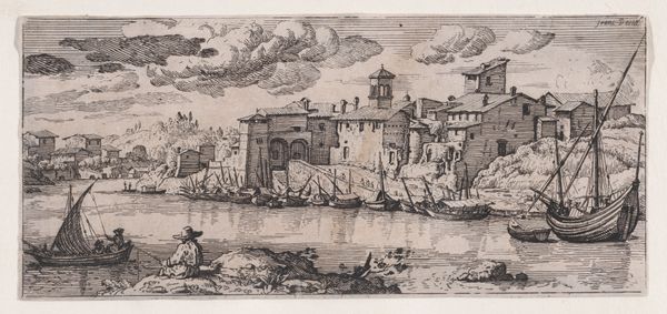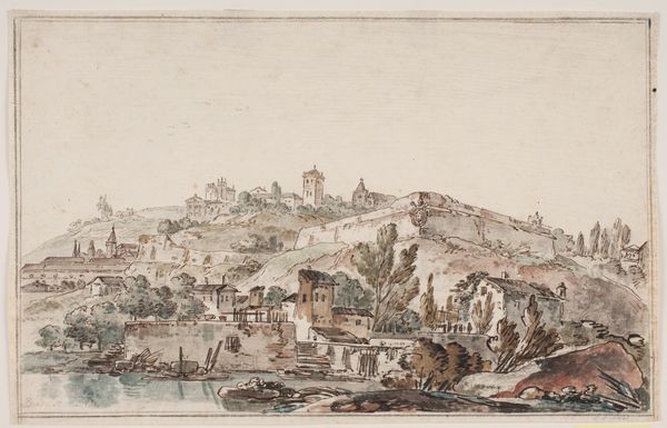 Curator: This delicate print, "Gezicht op de Engelenburcht en de Engelenbrug over de rivier de Tiber te Rome," dating to 1759, is attributed to Jean Daullé. It combines etching and watercolor. The work resides in the Rijksmuseum collection. What are your initial thoughts? Editor: It's surprisingly...peaceful. Despite depicting such iconic, historically loaded architecture, there's a definite lightness to the scene, a charming quality about it, especially with the gentle colors and almost decorative figures along the Tiber. Curator: The Castel Sant'Angelo, or the Mausoleum of Hadrian, began as a monument to imperial power, later repurposed as a papal fortress, looms in the image. Its evolution in form and function reflects a continuous transformation of authority and cultural memory, doesn't it? Note also St. Peter's Basilica in the background, a strong symbol of the Vatican's temporal influence. Editor: Yes, but let’s look closer at the materials and craft. This isn’t just an image of Rome; it’s a product. Etching allowed for detailed line work to delineate the buildings, while watercolor added those delicate, almost pastel-like hues. What kind of labor would go into creating and distributing something like this in the 18th century? Were these widely available prints? The process itself interests me. Curator: Daullé likely wanted to capture and then cater to a growing fascination with the antique past during the Rococo period, portraying Rome as both a site of grand history and contemporary vibrancy. It speaks to a nostalgic yearning but also solidifies cultural continuity. Editor: And I'm curious about the materiality of that yearning. Think about the paper, the pigments. These colors—how were they sourced, produced, and sold? The artistic choices depend so heavily on available materials. Rococo wasn’t just an aesthetic, it was a way of procuring, and consuming beautiful things. Curator: I'm drawn to the figures along the riverbank; they almost feel like stock characters in a pastoral play. These little scenes, are they supposed to ground the viewer, providing context for the vast history surrounding them? Do they connect us to our collective memory, as viewers of the past? Editor: Perhaps those small figures weren't incidental, but the subjects—workers who move the goods coming in and out of Rome, sustaining the grand scene behind them. Curator: Ultimately, this artwork reminds us of our lasting relationship with iconic structures. Editor: Absolutely, and this exploration reminds us how artistry relied on labor.