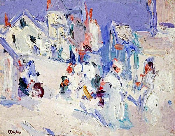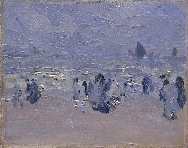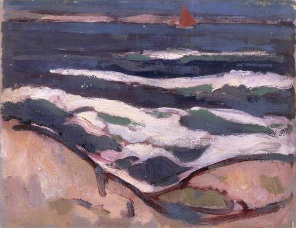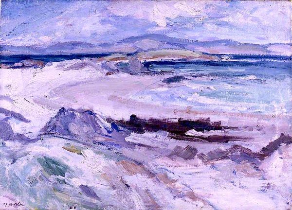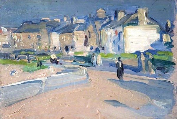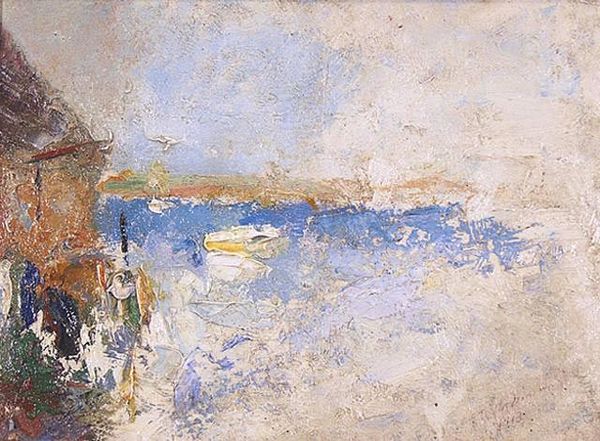 Samuel Peploe created 'Bernaval' with oil on canvas, featuring a scene dominated by gestural brushstrokes of blues, whites, and touches of green, evoking a windswept, coastal setting. The composition is dynamically divided, the sky and land merge into a single entity. Peploe's thick impasto technique brings a tactile quality to the canvas, where each stroke seems to capture the transient light and movement of the scene. This use of paint destabilizes the traditional representation of landscape, moving towards abstraction. The painting challenges our perception of space, inviting us to contemplate the interplay between representation and pure painterly form. 'Bernaval' becomes an exploration of how the very act of painting can redefine our engagement with the world.