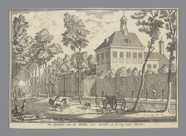 Curator: Welcome. We're standing before Daniël Stopendaal's "Gezicht op huis Nederhorst," an etching created in 1719. Editor: It’s got this… idyllic, almost theatrical quality to it. The figures seem staged against the backdrop of the house and grounds. There is a shallow depth to it. Curator: Absolutely. It depicts the estate Nederhorst. What’s fascinating to me is how this image served as a form of visual branding for the elite. Owning and displaying such depictions of one’s property was a status symbol. This announces wealth and societal position. Editor: Yes, there is a social dimension evident. Stopendaal does use a limited color palette here – pale blues, pinks, greens. Also note how precise and detailed Stopendaal's line work is in etching the architecture. What appears to be quite simple takes time to analyze to its precision and details. The artist meticulously differentiates the textures of the brick, water, trees... Curator: The inclusion of leisure activities—hunting, social gatherings, adds another layer to the social context. This scene implies an aristocratic lifestyle centered around pleasure and land ownership. Also, consider the historical function: prints like these circulated widely, influencing perceptions of status. Editor: Beyond the social messaging, the clouds above add to this. They give a certain dynamism that offsets the more static architectural rendering of the house. Notice too how the light filters differently, drawing one's eye across the image. It guides you toward its subjects. Curator: Indeed. The sky subtly reinforces that message. Stopendaal does provide a curated snapshot. An assertion of social standing disseminated through artistic means. Editor: Reflecting on Stopendaal's artwork, it has so much care within a small image. A blend of meticulous structure and dynamic rendering within the image. Curator: Quite. It’s a potent example of art’s entanglement with power and societal values of its time.