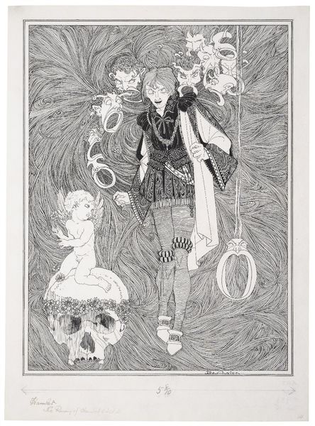 Editor: This is a pen and ink drawing by John Austen titled "Hamlet." I'm struck by the figure's confrontational glare and the overall feeling of contained tension, like a storm brewing. How do you interpret this work? Curator: That feeling of tension is key. Consider Hamlet's world, riddled with political intrigue and the suppression of dissent. Austen's sharp lines and use of black ink capture that claustrophobic atmosphere. How does the artist's style connect to your understanding of Hamlet's state of mind within the play? Editor: I see what you mean. The stark black and white and the busy lines do feel trapping. Does the elaborate costuming contribute? Curator: Absolutely. Think about the rigid social structure of Elsinore, and the pressure on Hamlet to conform. Austen uses details to explore the power dynamics embedded in Hamlet's story and within the broader context of early modern European royalty. Do you see any elements that hint at alternative readings? Editor: Maybe the halo-like shape behind his head? It's almost religious but has an unsettling feeling too. Curator: Precisely. Perhaps a subversion of traditional iconography? Austen might be questioning established power structures. The play, as a cultural artifact, becomes a space to debate identity, authority, and ultimately, resistance. Editor: I hadn't thought about the artist questioning power structures through Hamlet’s portrayal. Curator: Seeing art as a form of historical and cultural dialogue, shifts how we understand artistic interpretations. Editor: It's really made me think differently about approaching historical works, especially how relevant they can still be.