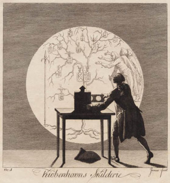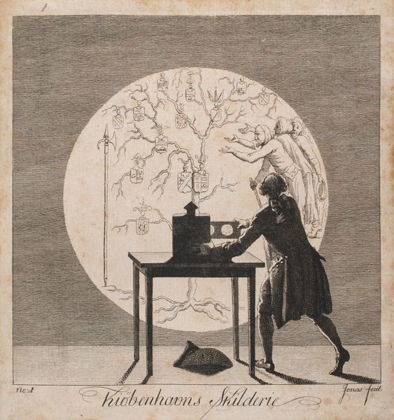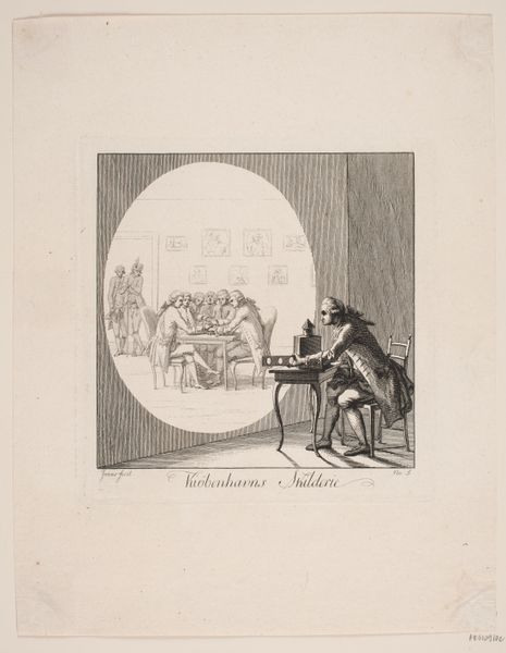 Editor: So, this print, "Kiøbenhavns Skilderie", nr. 2, by J.F. Clemens, was made between 1785 and 1788. It’s an etching, engraving, and drawing of a cityscape that depicts what appears to be a magic lantern show. It's intriguing how this everyday entertainment is depicted, and how the labor of one individual facilitates a visual spectacle. What do you see as important about this piece? Curator: As a materialist, I focus on the process itself. Consider the labor involved: the etcher meticulously creating the plate, the printer pulling the impression, and the vendor distributing it. This object connects to broader systems of production and consumption in 18th-century Copenhagen. It shows us not just what they *saw*, but how images were made, shared, and consumed by different social classes. Editor: That’s fascinating! So, instead of just appreciating the image, we should think about who made it, and for whom? Does the material it is made of change the context? Curator: Precisely. Engravings and etchings democratized images. Prints like this were more accessible than paintings, meaning more people had visual access to current events and entertainment. How does this particular "magic lantern" reflect the aspirations or anxieties of the late 1780s in Copenhagen? Are these depictions of theatrical acts or contemporary events? Editor: It's interesting to think of art like this not as some singular masterpiece, but as a widely distributed piece of media. The labor becomes part of the art! Curator: Exactly. By emphasizing its production and consumption, we challenge traditional art history's focus on individual genius, acknowledging how material conditions shape both the making and reception of images. Editor: Thinking about how the art object came to be, the work of the artist and printmaker opens it up to a bigger scope. Thanks, I had not considered art like this. Curator: Indeed, considering the conditions of production always offers fresh insights.
