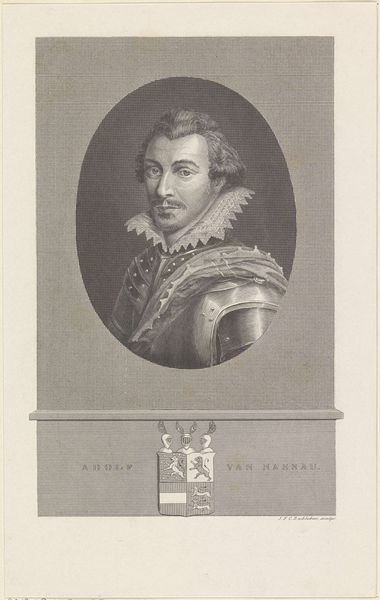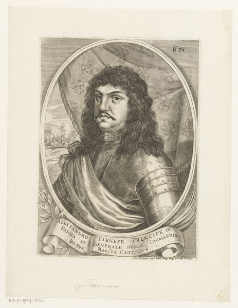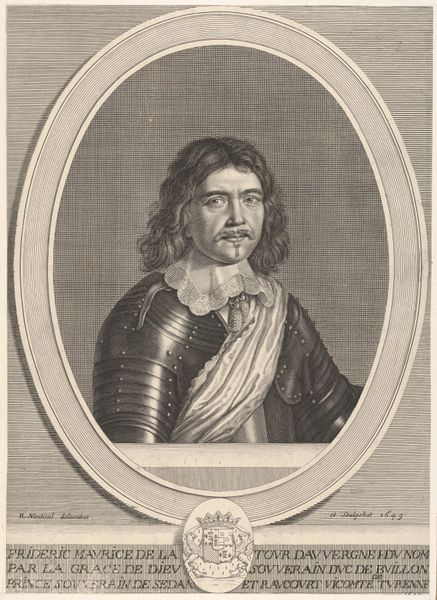 Curator: Pieter van Sompel created this engraving, titled "Portret van Hendrik III, graaf van Nassau-Breda," in 1643. Editor: It has such a serious and ornate vibe! The details feel carved rather than etched; the intricacy feels almost unbelievable. What do you make of it? Curator: For me, it is evocative, almost theatrically staged. Hendrik III is framed by a sort of heroic oval populated by putti, weaponry, and crests—symbols of power, legacy, and maybe even the burden of leadership. Editor: Exactly! The materials tell that story, don't they? I mean, engraving isn't the most forgiving process. It suggests dedication, craft—but also dissemination. Prints like these made the powerful accessible, like mass-produced valor. Curator: It is that dance between intimacy and distance which strikes me most. His gaze feels quite human—but look at the weight of his armour! I imagine it a suffocating shield of state. Almost a prison of grandeur, don't you think? Editor: Interesting point. All that armour... consider the labour involved in its making! The miners who extracted the ore, the blacksmiths shaping the metal, the engraver replicating it. An intricate network of skilled artisans made such an image – and Hendrik’s power – visible and tangible. Curator: True. It almost brings tears to my eyes, contemplating these unseen laborers, forever linked to the count's image... What if they were also making art, unbeknownst to even themselves? Perhaps even more poignant than Hendrik's portrayal here. Editor: In a way, this print acknowledges their contribution. By painstakingly detailing the symbols of power and production, Van Sompel inadvertently highlights the value of craft and manual skill within a rigidly hierarchical society. Curator: An elegy written in lines... I appreciate now the layers within this single work. It's not merely an image, but a woven record of social forces and human hands. Editor: Agreed. And maybe that’s the lasting power of this print. Not just Hendrik's face, but the story of how he – and representations of power in general – are constructed through labour and materials.