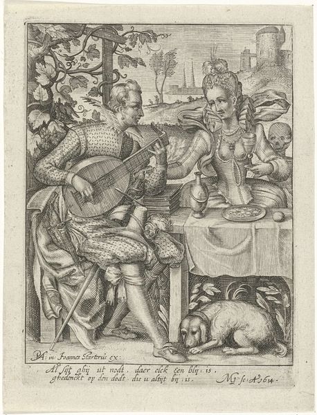 Christoffel van Sichem II created this woodcut of a mealtime gathering in the Netherlands sometime in the early to mid-17th century. The scene depicts a group of elegantly dressed individuals seated around a table laden with food and drink, inside what appears to be a wealthy home. Woodcuts like this one played a vital role in disseminating images and ideas during the period. As a relatively inexpensive and easily reproducible medium, woodcuts facilitated the spread of visual culture to a broader audience than painted works. In the context of the Dutch Republic's burgeoning print culture, images of convivial gatherings reflected and reinforced the social norms and values of the time. To fully understand this print, we would need to delve deeper into the cultural and economic history of the Dutch Golden Age. We could explore the period's visual culture through estate inventories, conduct genealogical research to find out who was buying these works, and investigate the social function of images in the Netherlands during this period.