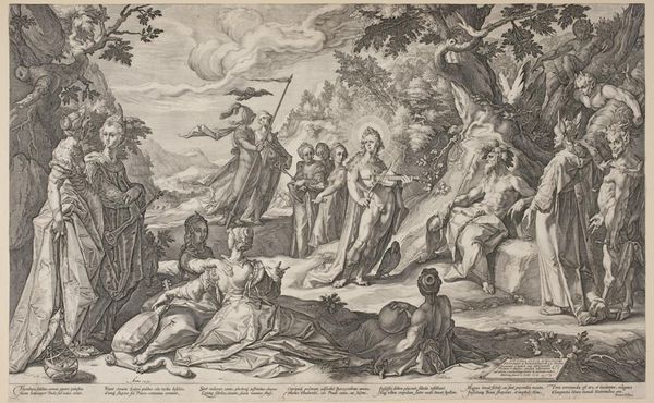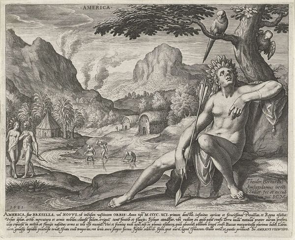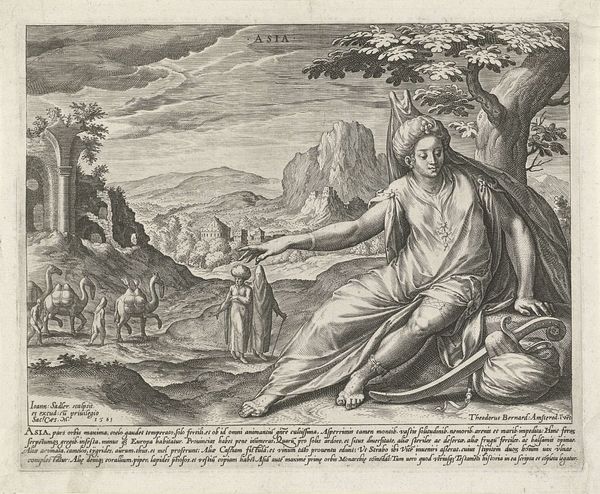 Curator: This engraving, titled "Asia" by Johann Sadeler I, presents a fascinating early modern European imagining of the continent. Editor: It’s quite striking. The figure of Asia dominates, but there’s a melancholy air about her, like she’s burdened by the landscape behind. Curator: That landscape is crucial. The inclusion of camels, figures in turbans, and architectural ruins speaks to the era's understanding—or perhaps misunderstanding—of Asian geography and culture. Editor: Right, it's less about accurate depiction and more about allegorical representation, isn't it? The woman embodies "Asia" itself, almost like a personification of colonial desires. Curator: Precisely. We see the conceptualization of the "Orient" as this exotic, resource-rich land ready for the taking. The print thus reveals more about European ambition than Asian realities. Editor: It really does make you consider the power dynamics inherent in how cultures are represented, then and now. Food for thought.