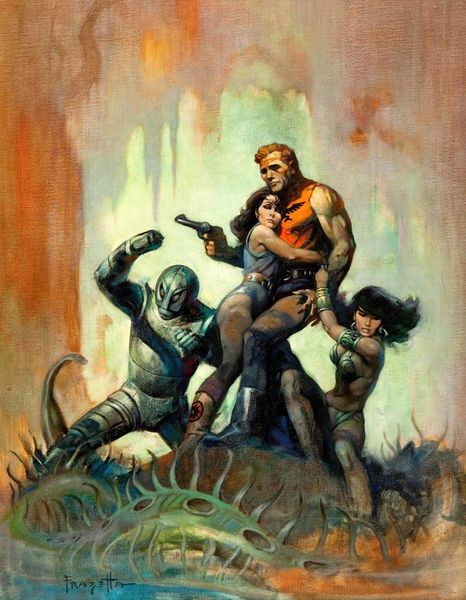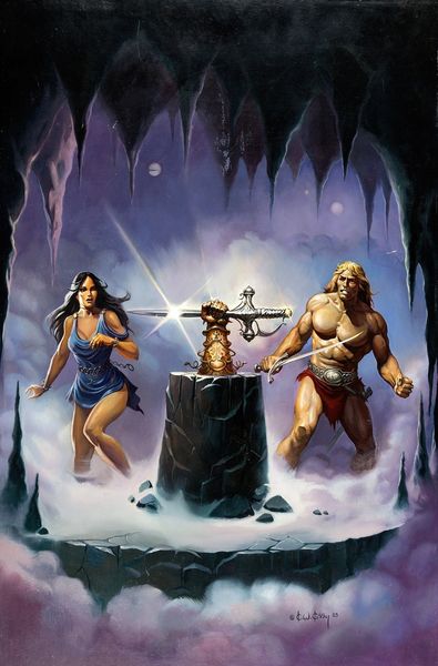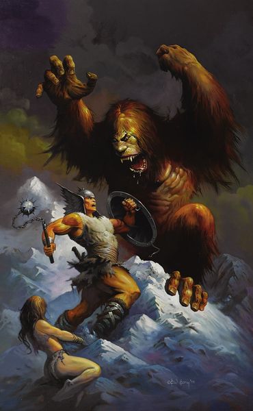 Editor: Here we have "Conan the Valiant," a 1988 acrylic painting by Ken Kelly. It's dramatic – the hulking figure of Conan facing down a grotesque monster! The composition is almost triangular, leading our eye straight to the confrontation. What really grabs you when you look at this piece? Curator: It roars with pulp energy, doesn’t it? Kelly's Conan isn't just a barbarian, but a study in heroic defiance. The colours pulse, but that’s Kelly winking at the classical heroic depictions. This isn't some serene, god-like warrior; this is Conan in the thick of it, raw and visceral. How do you think the monster’s greenish glow is created? Editor: Probably to highlight its otherworldly nature...it makes it seem even more intimidating, you know? This use of color contrasts really heightens the tension. It really does remind me of, say, the old comic book covers. Curator: Absolutely! And it is pulp heroism…but Kelly lets on in the composition… Conan is strategically placed in the shadow… it hints at that interior struggle within the heroic frame! The icy environment frames the conflict, but what do you think it tells us? Is there also perhaps something about inner psychological spaces? Editor: Mmm, I’m seeing it! Almost as if that cave symbolizes his state of mind - facing some huge mental challenge, or inner demon! The details on those figures – the musculature and the ferocity – contrasted with this very cool atmosphere… Curator: Exactly! It's where Kelly teases us and draws the viewers in; in that contrast between an external challenge that forces an examination of one’s self! It is fun stuff. Editor: Well, I’ll never look at Conan the same way again! I’ll definitely try and notice the interior depths going on in these covers more consciously.