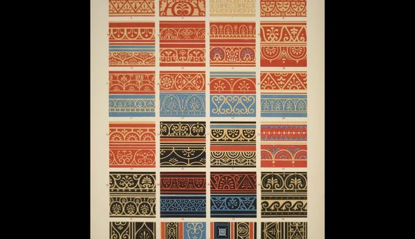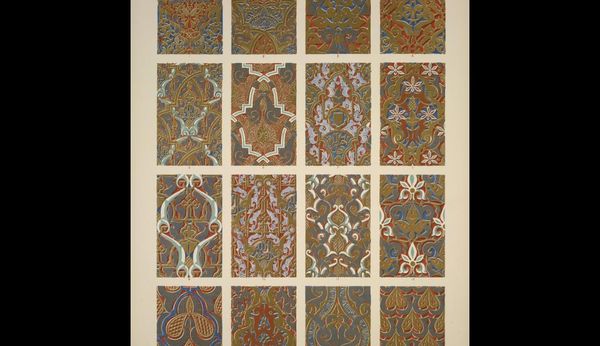 Editor: So, here we have "Byzantine No. 2a," a print by Owen Jones from 1856, showcasing a series of intricate, textile-like ornament designs. I find the sheer density of pattern quite overwhelming. How do you interpret this work in its historical context? Curator: It’s not just pattern, but power. Consider 1856: the height of British Imperialism, fueled by industrial production and a hunger for resources and cultural capital. Owen Jones's work, seemingly decorative, is deeply implicated in this project. These "Byzantine" designs weren't viewed as simply aesthetic; they were understood as embodiments of cultural heritage, appropriated and re-presented for a Victorian audience, reinforcing colonial power structures. How does the act of replicating these patterns, stripping them of their original context, resonate with you? Editor: It feels… appropriative, even if the intention might have been to celebrate them. Like the Victorians were “collecting” cultures. So the “ornament” serves a larger purpose. Curator: Exactly. Ornament becomes a tool. Jones and his contemporaries believed in the moral power of design, thinking good design could uplift society. But who defined "good," and whose society were they uplifting? The orientalizing aesthetics flattens the source culture by converting symbols into decorative objects. How do you think the act of mass-producing these designs, making them accessible to a wider audience, might have further complicated the relationship between the colonizer and the colonized? Editor: It probably normalized the appropriation, blurring the lines further. By making them widely available, they become less ‘Byzantine’ and more… well, Victorian. I see it differently now! Curator: Precisely. The beauty masks a complex negotiation of power, knowledge, and representation. It reminds us that aesthetic choices are never neutral; they always carry a cultural and political charge. Editor: Thank you, that’s made me think a lot. Curator: Likewise. It’s in this intersection of historical analysis and contemporary critique that we find a richer understanding of art.