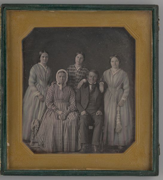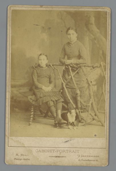 This photograph of three girls and a boy, likely siblings, was made by Abraham Koorenhoff in Leiden. The image is printed on a thin card, a popular format in the late 19th century known as a "carte de visite." Photography in this era was becoming more accessible due to industrial advancements, yet it remained a laborious process. Each print required careful chemical processing, and the photographer's skill was crucial in achieving a clear image. The sepia tone is a result of the chemical development, giving the image a warm, aged feel. Consider the clothing of the children, likely reflecting a family of some means. These textiles, mass-produced yet carefully chosen, speak to the growing consumer culture of the time. The act of commissioning a portrait itself indicates a certain social standing, a desire to capture and preserve a moment in time. By understanding the materials and processes involved, we can appreciate how photography democratized portraiture, while still reflecting the social and economic realities of its time.