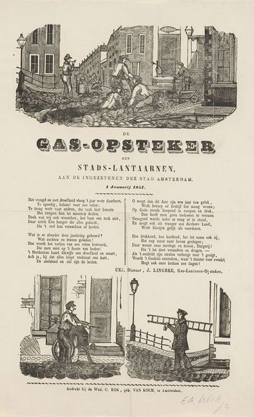 Editor: This print, entitled "Nieuwjaarswens van de gaslantaarnopstekers van Amsterdam voor het jaar 1854," roughly translates to "New Year's Greetings from the Amsterdam Lamplighters for the Year 1854." It dates back to around 1853-1854 and it seems to have originated from Amsterdam. The print, or engraving, feels almost like a historical snapshot, depicting city life, but it also carries this sentimentality of well wishes and public service. How do you interpret this work within its historical context? Curator: It's fascinating how this seemingly simple print encapsulates the societal dynamics of mid-19th-century Amsterdam. The lamplighters, crucial to public safety and the rhythm of urban life, are using this medium to communicate directly with the citizens. Think about it—what does it mean for the working class to participate in this form of public address? Editor: I guess it highlights a sense of community responsibility and perhaps even a bid for recognition or respect. They're not just anonymously performing their duties; they are actively wishing prosperity and safety to the city. Curator: Exactly. And let’s consider the form. A print meant for public consumption meant it was accessible. These workers aren't merely lighting lamps; they are attempting to engage in shaping civic identity and articulating a vision for the future. This is not top-down pronouncements but a collective of people doing the hard work. Where do we see echoes of this today? Editor: Hmm, I suppose we see similar expressions through things like public art, community initiatives, and even social media campaigns where ordinary citizens voice their hopes and concerns. It’s a bottom-up dialogue that can affect societal change. Curator: Precisely. The wishes for prosperity, safety, and unity during a time when the role of the 'gas-opsteker' would undergo drastic technological change, connects to today’s concerns and underscores the ongoing dialogue of how labor, class, and the very technologies we use shape the public sphere and collective identity. It provides valuable cultural understanding for how people are connected with each other. Editor: That’s a really interesting way to frame it! I never thought about this as being linked to public engagement. Thanks, that gave me a totally new perspective.