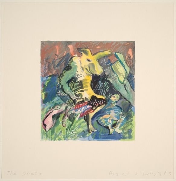 Curator: Well, if this isn't delightfully bizarre. It feels like a party I vaguely remember from a fever dream. Editor: Precisely! And allow me to introduce Gladys Nilsson’s watercolor print, “The Juggler," created in 1993. The artist invites us into her singular world of eccentric characters. Curator: Eccentric is definitely the word! I mean, we have a central figure seemingly juggling slices of chocolate cake with an intense focus, amidst…what *is* that going on in the background? Some sort of mass picnic? Editor: In a way, yes. It’s chaotic and joyful all at once, wouldn't you agree? Nilsson often depicted these fantastical social scenes, pushing the boundaries of figuration. There's a subtle critique here of consumption and entertainment, reflecting the societal values she saw emerging in late 20th century America. The watercolor print, as a medium, softens the intensity, creating a somewhat nostalgic aura. Curator: Nostalgic…perhaps like a circus viewed through a kaleidoscope. The figure's facial expression… it's so detailed, almost grotesque, but endearing. Like a character from a children’s story gone wonderfully wrong. And the color palette, quite daring, isn’t it? Editor: Nilsson embraced bright, contrasting colors to enhance the surreal atmosphere. The juxtaposition of the domestic act of "juggling cakes" with a frenzied backdrop creates this wonderfully disorienting effect. It draws us to ask about this strange celebration: Who is she juggling for? The crowd? Or just herself? Curator: Maybe the audience is really us. The whole artwork is this bizarre reflection, forcing you to consider our own frenetic, over-stimulated existence. You know, there is something almost spiritual here... Like she's offering us a piece of the action. A bit like the Eucharist at church - where you must ingest and consume in the great juggler’s theater! Editor: It's certainly food for thought. As the piece enters our permanent display we hope it opens to the public how powerful introspection can be through these visual feasts. Curator: Well, it’s sure made me hungry. And perhaps a bit thoughtful about our own juggling act as spectators. Editor: Indeed! Let’s step onward. There's plenty more feast for your eyes ahead.