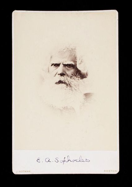 Editor: This is a sepia photograph by William Notman, portraying Evangelinus Apostolides Sophocles. The dreamy haze and the subject's intense gaze give it a rather ethereal quality. What's your interpretation? Curator: It's as if Notman has captured a sage, lost in thought, wouldn't you agree? The soft focus almost feels like a veil, drawing our attention to Sophocles’ profound intellect rather than stark realism. It whispers of inner worlds. Editor: That's beautifully put! I hadn't considered how the soft focus emphasizes his intellect. Curator: Perhaps Notman aimed to reveal the soul beneath the surface. It’s a dance between presence and absence, isn't it? Editor: Definitely. It's much more nuanced than I initially perceived!