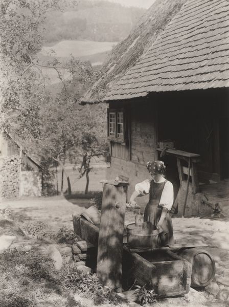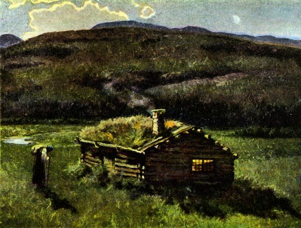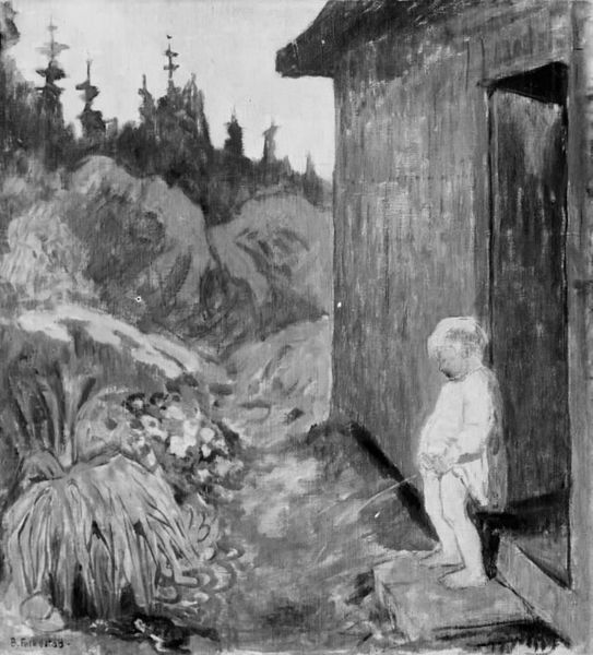 Curator: Here we see "Farvel Da Mor", which translates to "Goodbye, Mother", by Theodor Severin Kittelsen. It's rendered in monochrome, offering a poignant scene. Editor: Stark. My immediate reaction is melancholy; the muted tones give a weightiness to what seems a solitary journey. Look at how the dark, dense figure of the child almost merges with the shadowed foreground. Curator: Indeed. The somber quality is partly intended. Black and white often strips away distractions, guiding us toward raw emotion. What is most interesting to me are the symbols; a solitary figure evokes a journey—possibly a rite of passage or an unwelcome departure. It has archetypal resonances of leaving the maternal for an uncertain future. Editor: It is worth exploring the medium and material context, however. Without knowing the exact materials, my instinct tells me this may be made from industrial graphite materials rather than purely natural chalk. That choice, whether intentional or economical, adds an industrial-era flavor and may play with the theme. The rural idyll collides with the stark realities of available manufactured media. Curator: A valid point. If a commercially-produced medium was indeed chosen, the landscape loses its pre-industrial innocence, its accessibility even, in light of wider socioeconomic forces. Editor: Furthermore, considering how the print may have been consumed adds more nuance. It isn't purely personal; instead, maybe this was produced as a memento mori for mass distribution to signal specific, sentimental attitudes, given the growth of printmaking culture in this time. Curator: Thematically speaking, Kittelsen had an inclination for exploring Norwegian folklore, which is often inseparable from the landscape. Here, the backdrop is more than just scenery. It becomes a character, almost a spiritual presence guiding the child. Editor: It pushes us to see how materials participate and shape the perceived cultural landscape, reflecting production, class and commercial opportunities. We’re reminded how intimately our emotional states intertwine with economic ones, whether or not we choose it that way. Curator: Precisely. It deepens our reading when materiality joins the discussion. The symbol and matter converse and complicate our interpretation of Norwegian identity, home, and the modern world. Editor: A reminder to interrogate and contextualize the apparent quietness. It is never still if the factory lurks behind that landscape.