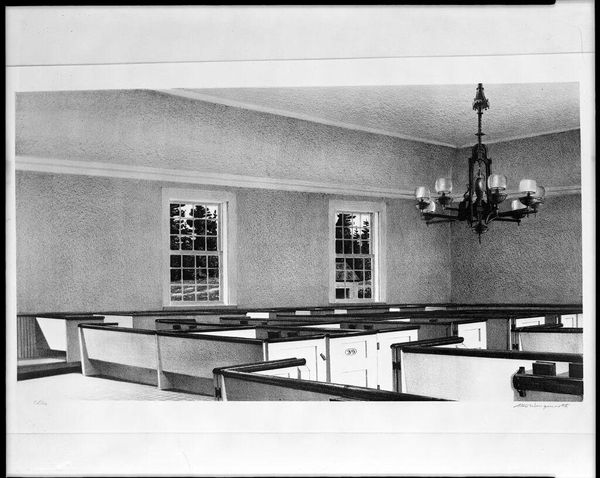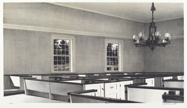 Curator: Stow Wengenroth, born in 1906, was a master of lithography. This piece, titled "Serenity," captures an interior space, perhaps a church. Editor: Wow, that's…intense. All those parallel lines of the pews disappearing into the distance. Gives me a slightly unsettling feeling, like a visual echo. Curator: It's interesting you say that. Wengenroth often sought to depict quiet, contemplative spaces, but there's also an undeniable geometric rigor. Consider how the architecture dominates. Editor: Right! The light from the windows gives it a sense of hope, but the architecture definitely dominates, almost imposing. There is a certain beauty in it. Curator: Wengenroth's work was deeply influenced by the American scene movement; he was fascinated by the urban and rural landscape. Here, he examines the architectural landscape. Editor: It's more than just an image. You can almost hear the silence, feel the cool air. It's as if he's inviting us to contemplate within this stark geometry. Curator: Indeed. His meticulous technique and sensitive handling of light transform the mundane into something profoundly evocative of a particular history. Editor: So many straight lines! Yet the emotion is there. Makes you look differently at your surroundings. Thank you.