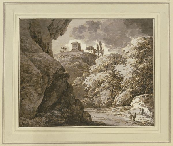 Editor: Here we have "Landscape with Two Resting Travelers" by Franz Kobell. It's an ink and watercolor drawing, and honestly, it feels a bit like a scene from a dream. Almost like a stage set. What do you see in this piece? Curator: It whispers stories, doesn't it? To me, this drawing breathes the very air of Romanticism. It's that yearning for nature, a kind of melancholic beauty... And notice the two figures tucked away in the corner? Are they lost in thought, or perhaps in love? Editor: I hadn’t really considered the placement of the figures within such a grand scene. They seem so small compared to everything else around them! It does give it a pensive tone. What was it about this "yearning for nature" during that time? Curator: Imagine a world rapidly changing, becoming more industrialized. Nature, then, becomes an escape, a pure, unspoiled refuge for the soul. The artist isn't just drawing trees; he's painting an emotional experience, inviting us to reflect on our place in the universe. Don’t you just ache to sit beside them? Editor: Definitely! Now I see it, a quiet rebellion. I never thought of landscape art that way before. I suppose it’s more about an emotional escape than actual travel. Curator: Precisely! The light, the shadows... they dance together to create a feeling. And you start to understand why someone would rather be lost in a drawing than found in a factory. What an invitation to slow down and appreciate the moment. Editor: Thank you. It’s fascinating how the artwork has captured this moment and this mood, and how the artist is offering the experience of escape.