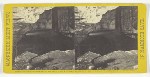 H.D. Udall captured this stereograph titled "Entrance to Ante-Chamber" to be viewed with a stereoscope. This photographic technique, popular in the 19th century, aimed to replicate human binocular vision, offering viewers an immersive, three-dimensional experience. The "Entrance to Ante-Chamber" invites contemplation on themes of exploration and discovery but also of ownership. During this period, landscape photography often served to promote a romantic vision of the American frontier, subtly reinforcing narratives of expansion and the concept of manifest destiny. The photograph also prompts us to consider the relationship between nature and culture, and the ways in which we perceive and interact with the environment. Udall's choice of vantage point, framing the natural rock formations as an "ante-chamber," transforms nature into a spectacle. This photograph offers both an aesthetic experience and encourages reflection on our place within the larger cultural and environmental landscape.