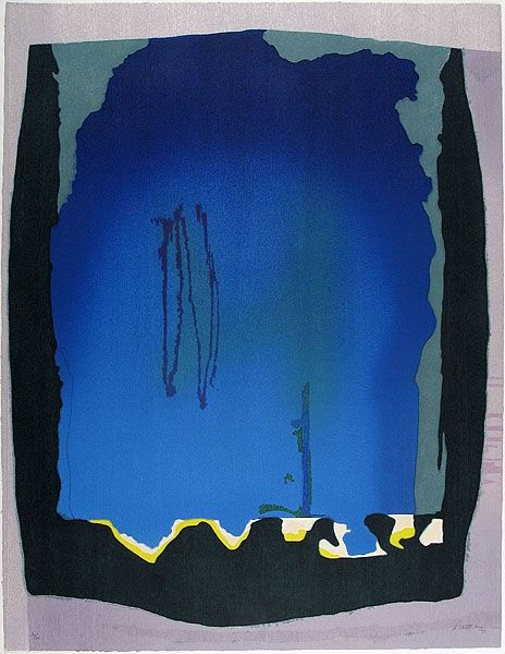 John Hoyland made this screenprint, titled Memphis, in 1980. The textures are calling to me here, the way the inky blues have been laid down feels quite improvisational, like a kind of built-up collage. I can see the physicality of the medium in that big, blocky shape at the top; its density is so palpable, you almost feel like you could reach out and touch it. It makes me wonder about the tools Hoyland might have used, the kind of pressure he applied to create that level of texture. And then there's that dark, square shape in contrast, which brings a certain grounding element to the composition. The translucent quality of the inks adds a beautiful depth, like you're looking into a layered world. This play with textures and geometric forms reminds me a little of the work of someone like Patrick Heron, where color and shape become these vehicles for emotional expression. With Memphis, it's like Hoyland is inviting us into a conversation, a dialogue about seeing and feeling, where ambiguity isn't a problem but a possibility.