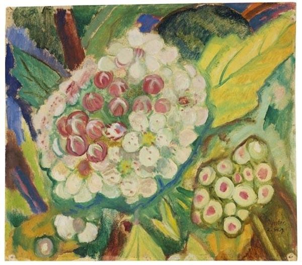 Gabriele Münter painted this still life called Blumen auf Weiß – that’s Flowers on White – with oils, and you can tell she was really feeling the process of pushing paint around. I love how the colors are both realistic and totally made up – the leaves are green, sure, but also kinda purple and brown. And those white flowers! They're not just white, are they? See how she’s used gray to give them shape and weight? It's like she's inventing these flowers as she goes, not just copying them. The brushwork is so direct, you can practically see her hand moving. There's this one little red dot near the top – what’s that doing there? It doesn’t quite “fit” in the scene, but it kind of wakes the whole painting up. Like a little glitch in the matrix. It reminds me a bit of Marsden Hartley, he did these amazing colorful paintings in a similar vein. Anyway, this piece is all about how painting can be a way of seeing, not just recording.
