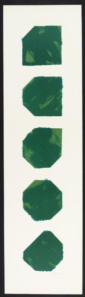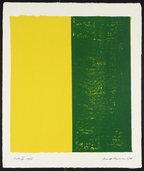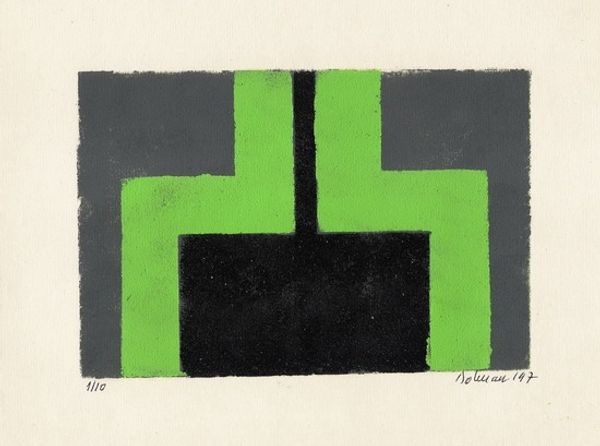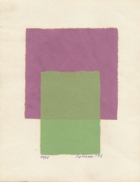 This abstract print was made by Vasile Dobrian, sometime in the last years of the 20th century. It’s a study in contrasts, a rectangle of warm orange sits above a sequence of vertical stripes in green and brown. The surface has this really interesting, almost chalky texture. You can see the grain of the paper coming through. Up close, the orange area has this mottled, uneven finish, which gives it real depth and keeps it interesting. It feels like the orange was laid down in layers, scrubbed and blended – I can almost feel the artist working the material! There's something so satisfying about the way Dobrian has allowed the marks to remain visible. Look how the crisp lines of the vertical stripes create a visual rhythm. Think about the push and pull between control and spontaneity. For me, Dobrian's work has the directness and honesty of someone like Agnes Martin, but with a playful, almost childlike quality.